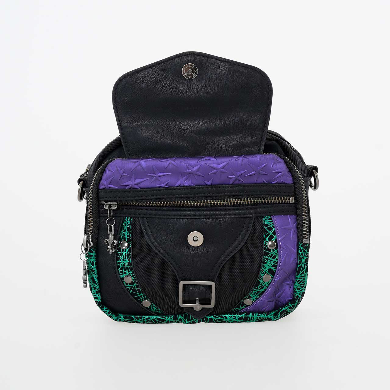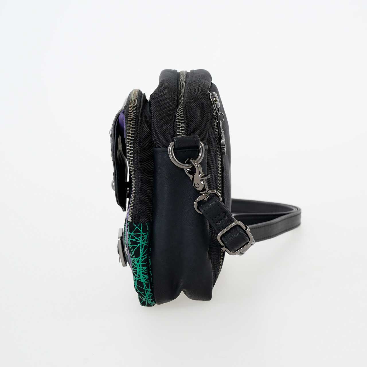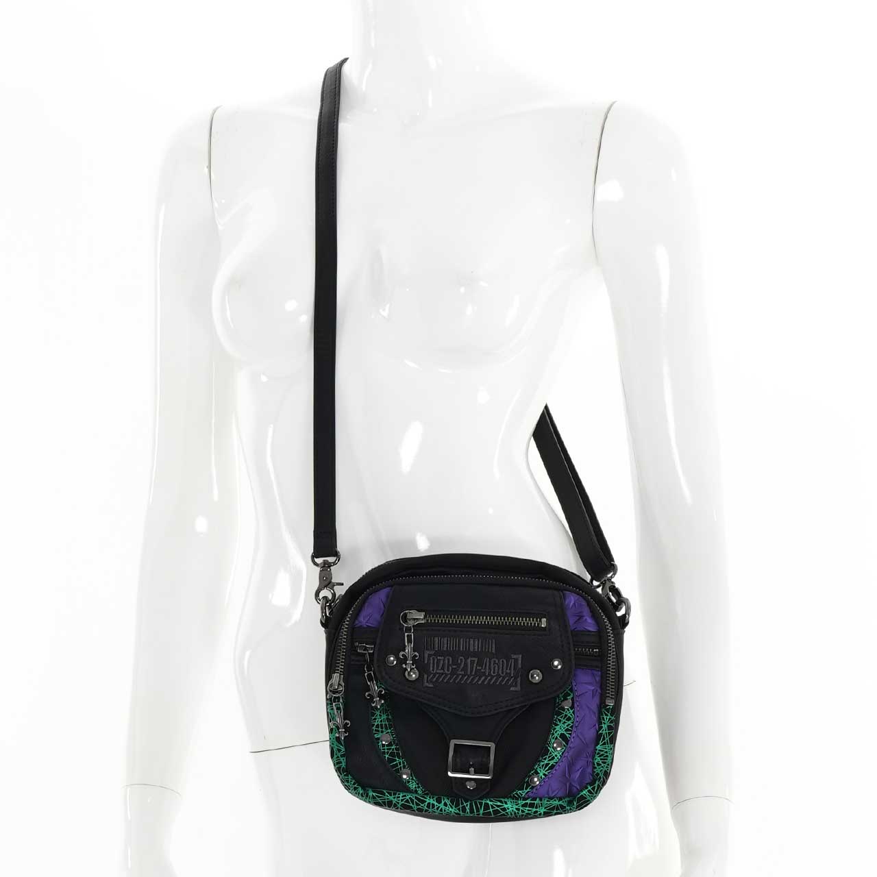 デザインにはバックル飾りやビョウなどの金具がアクセントとして使用されており、個性的でスタイリッシュな外観が特徴です。
