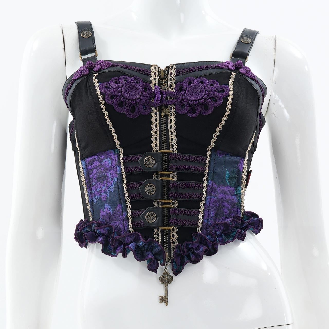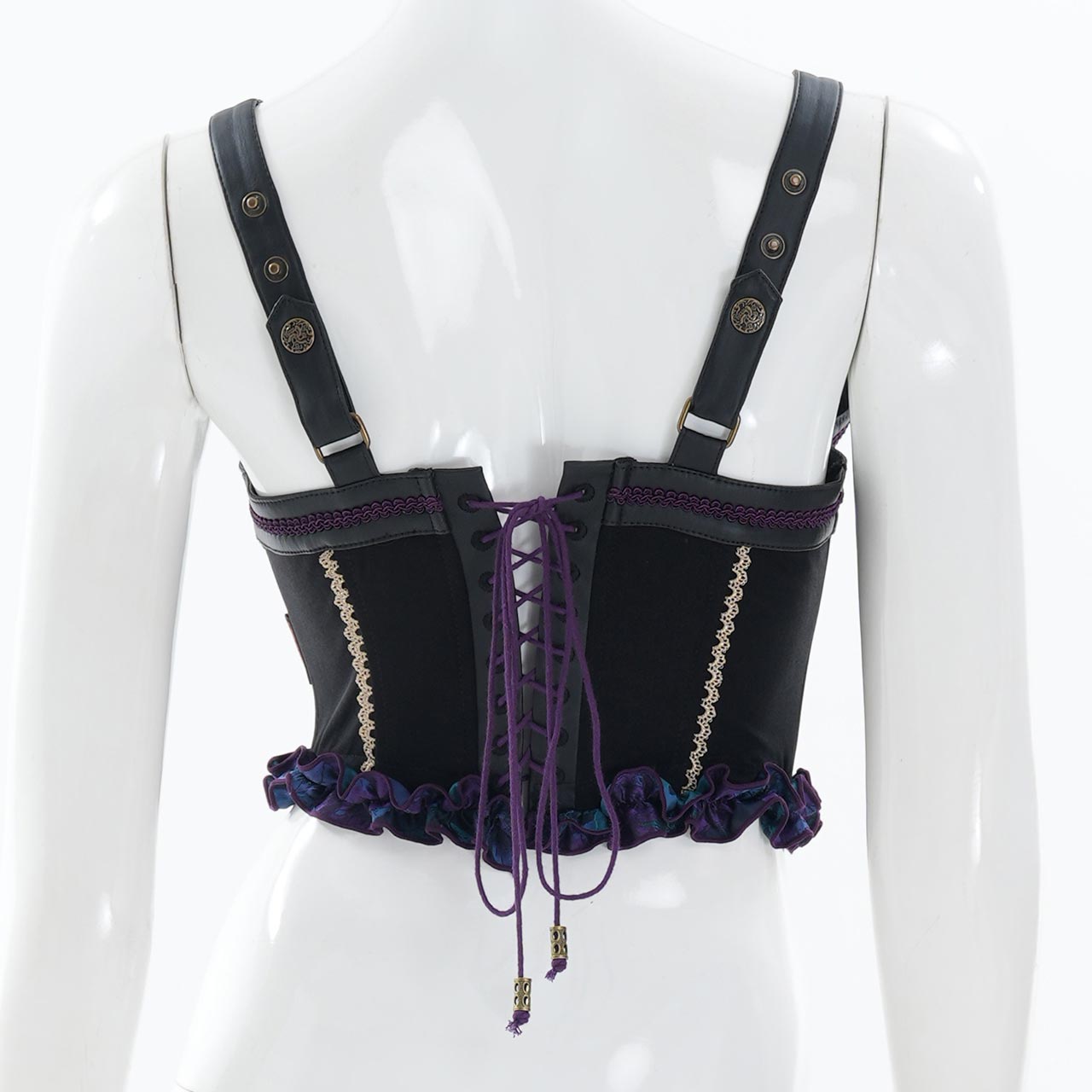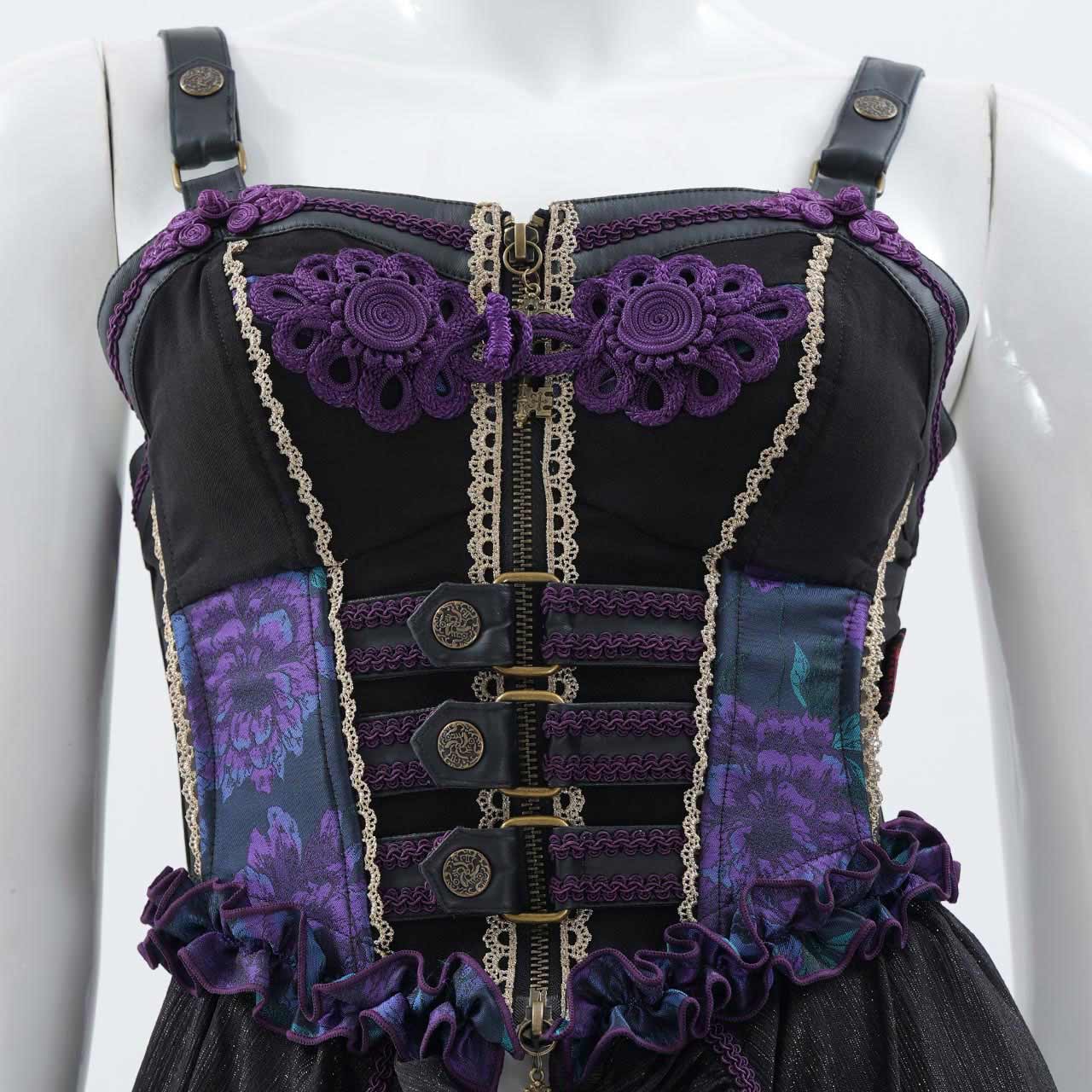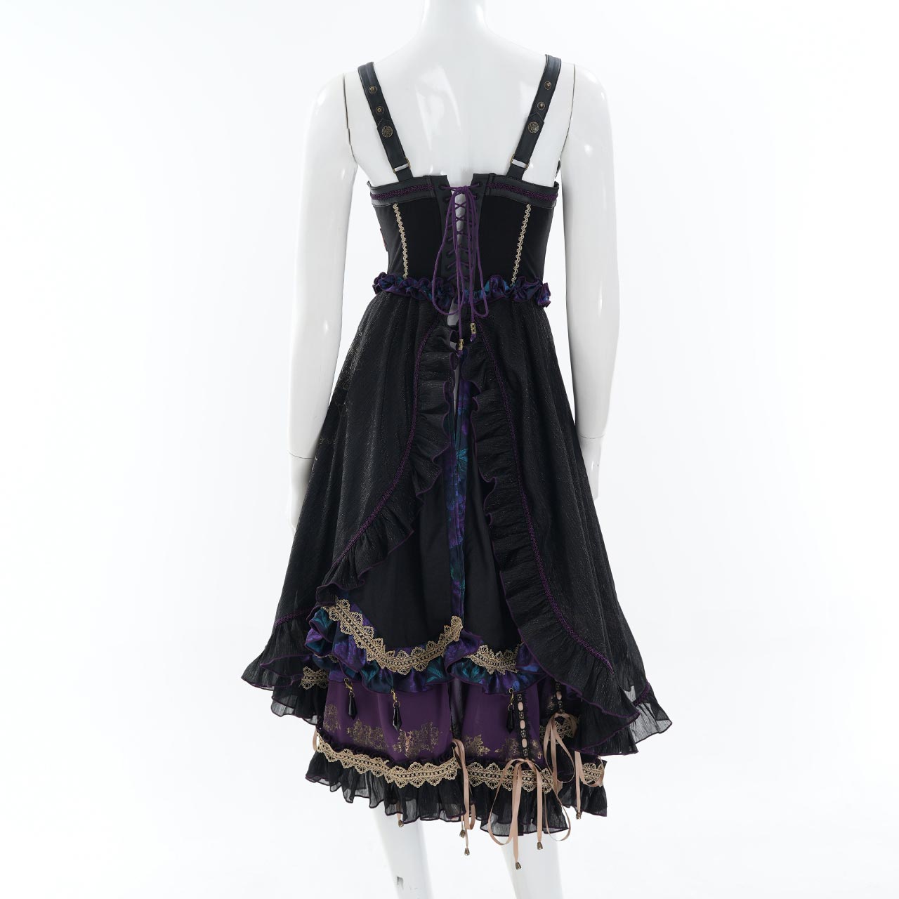 フロントはコルセットを思わせる装飾でウエストを引き締め、左右に流れるスカートパーツが、動くたび幻想的な陰影を描きます。