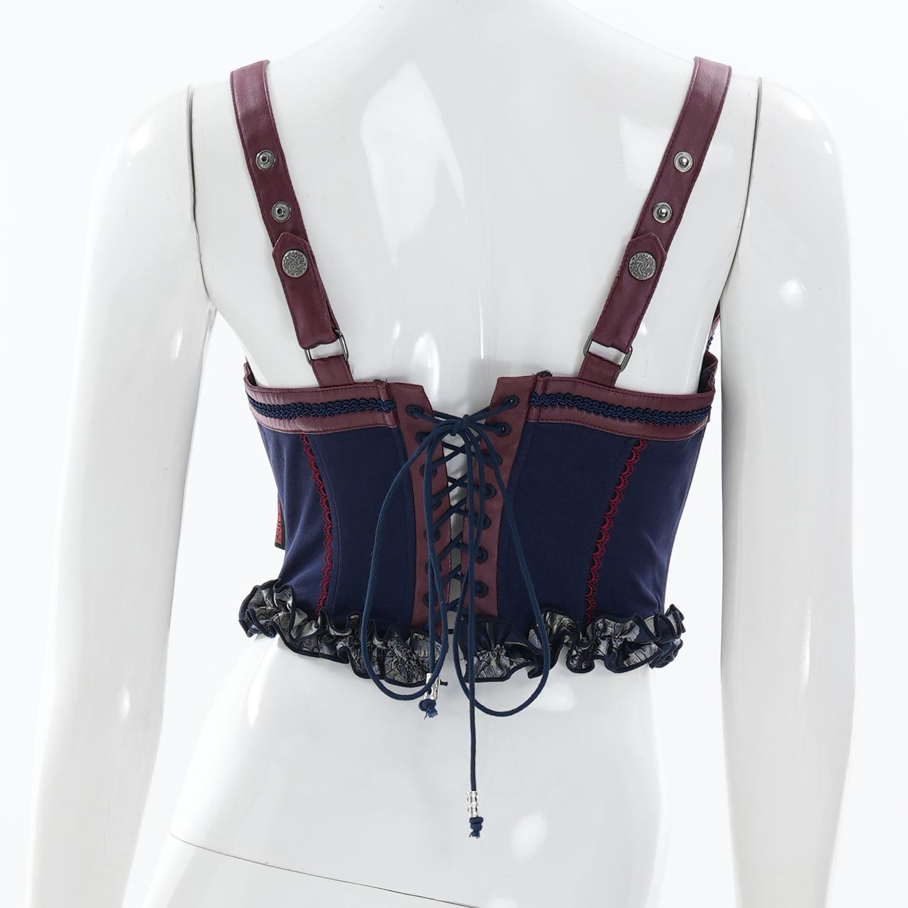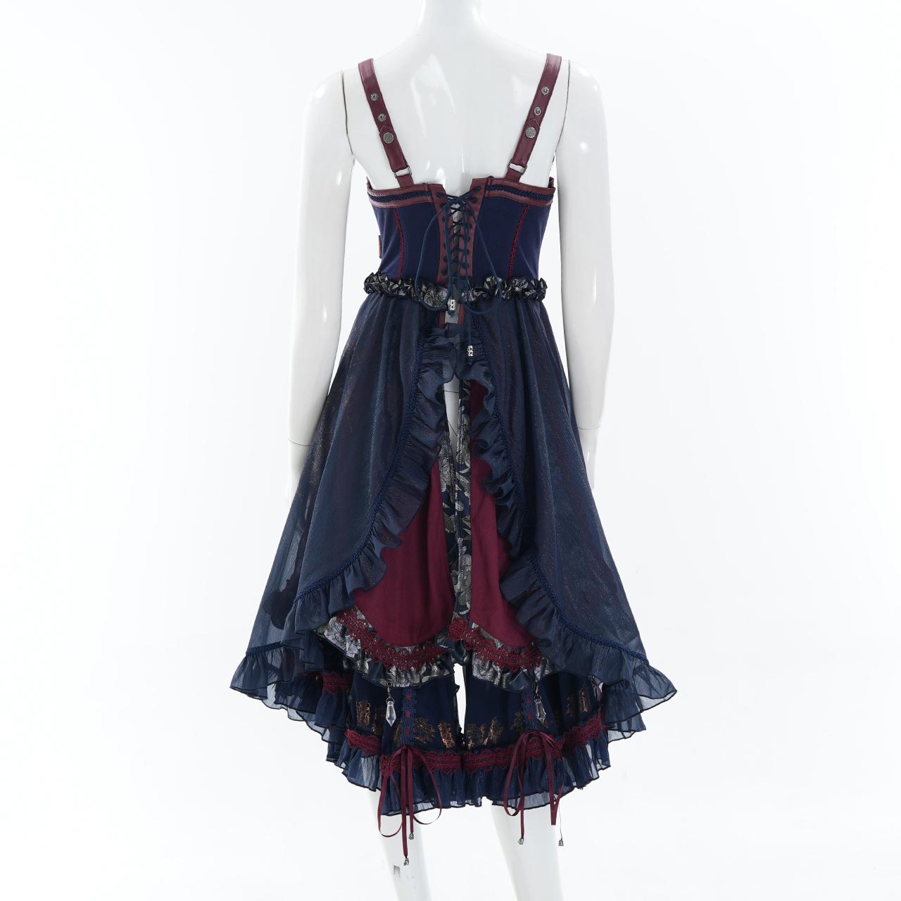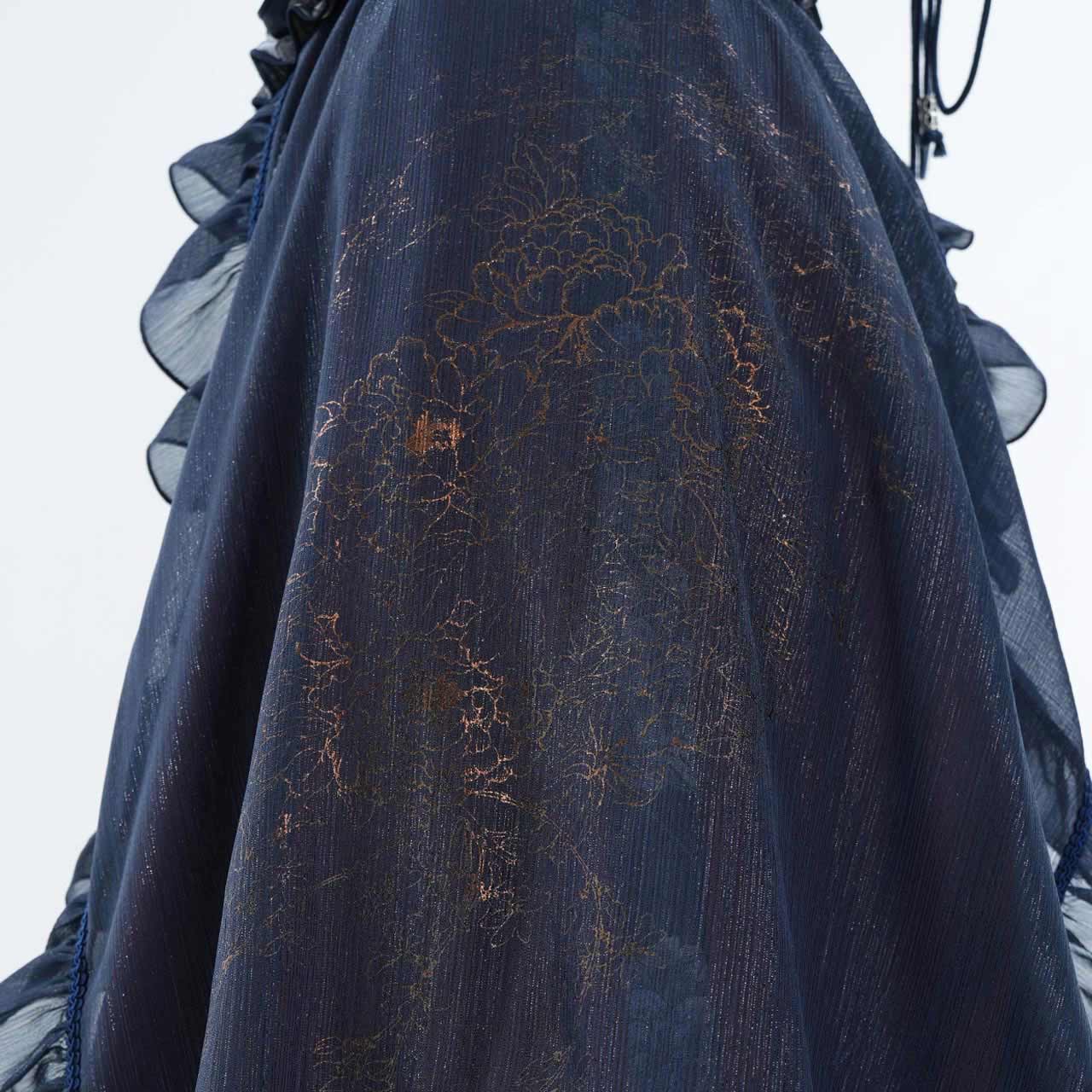 フロントはコルセットを思わせる装飾でウエストを引き締め、左右に流れるスカートパーツが、動くたび幻想的な陰影を描きます。