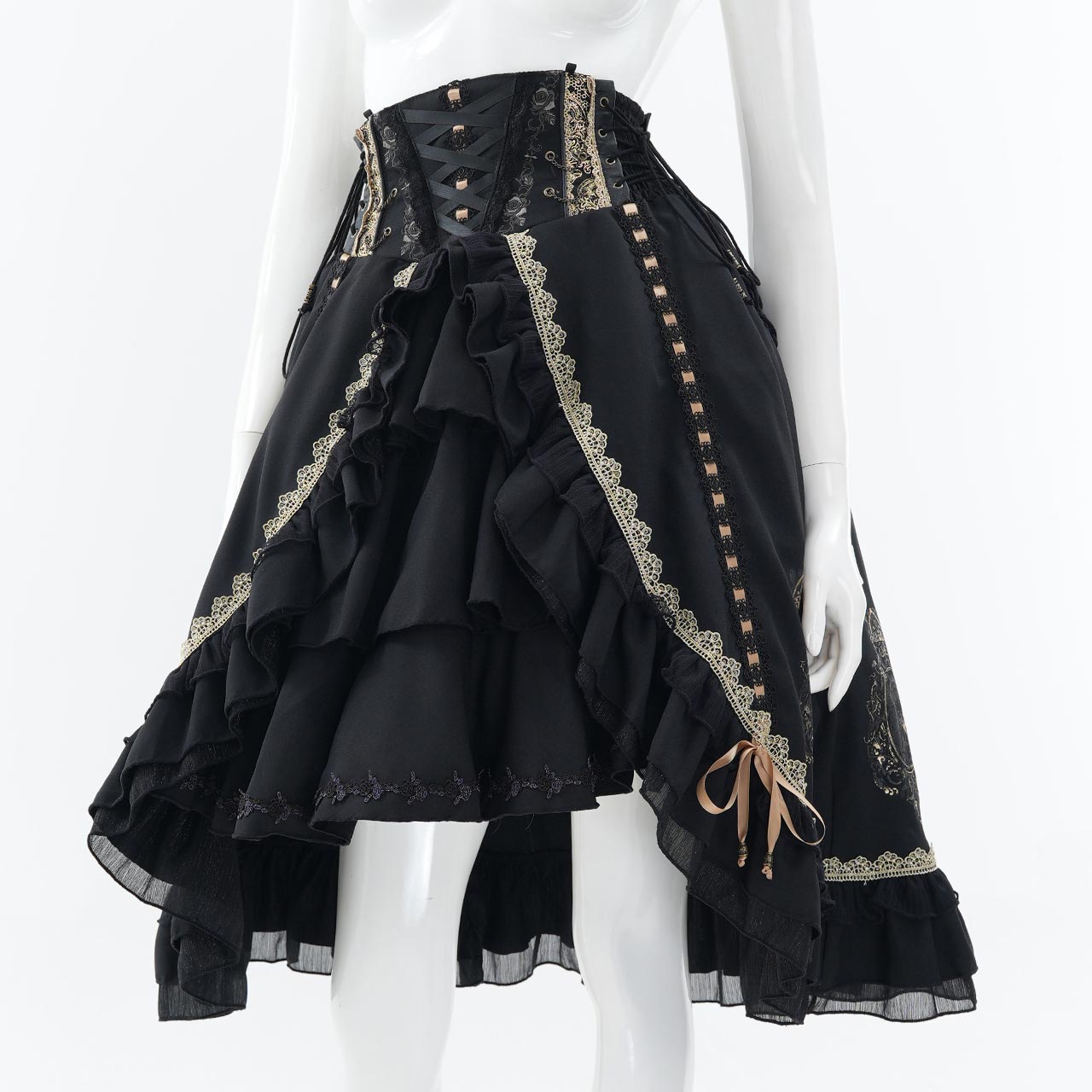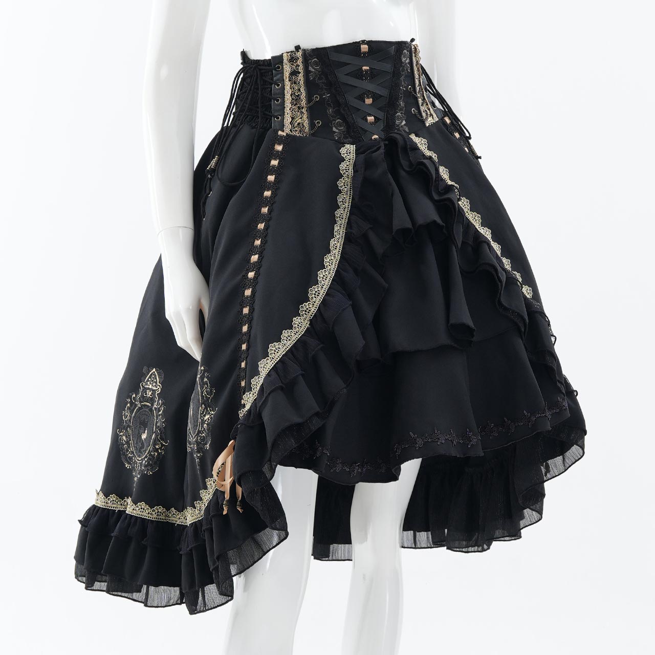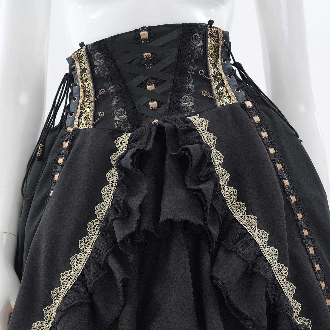 レースアップや甘めフリルが乙女心をくすぐる可憐なデザインでありながら厳かなクラシカルロリィタの要素も併せ持つ、フリルスカートです。