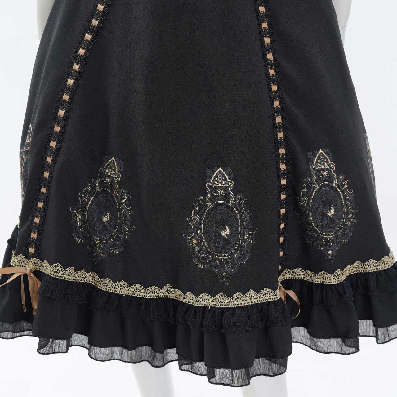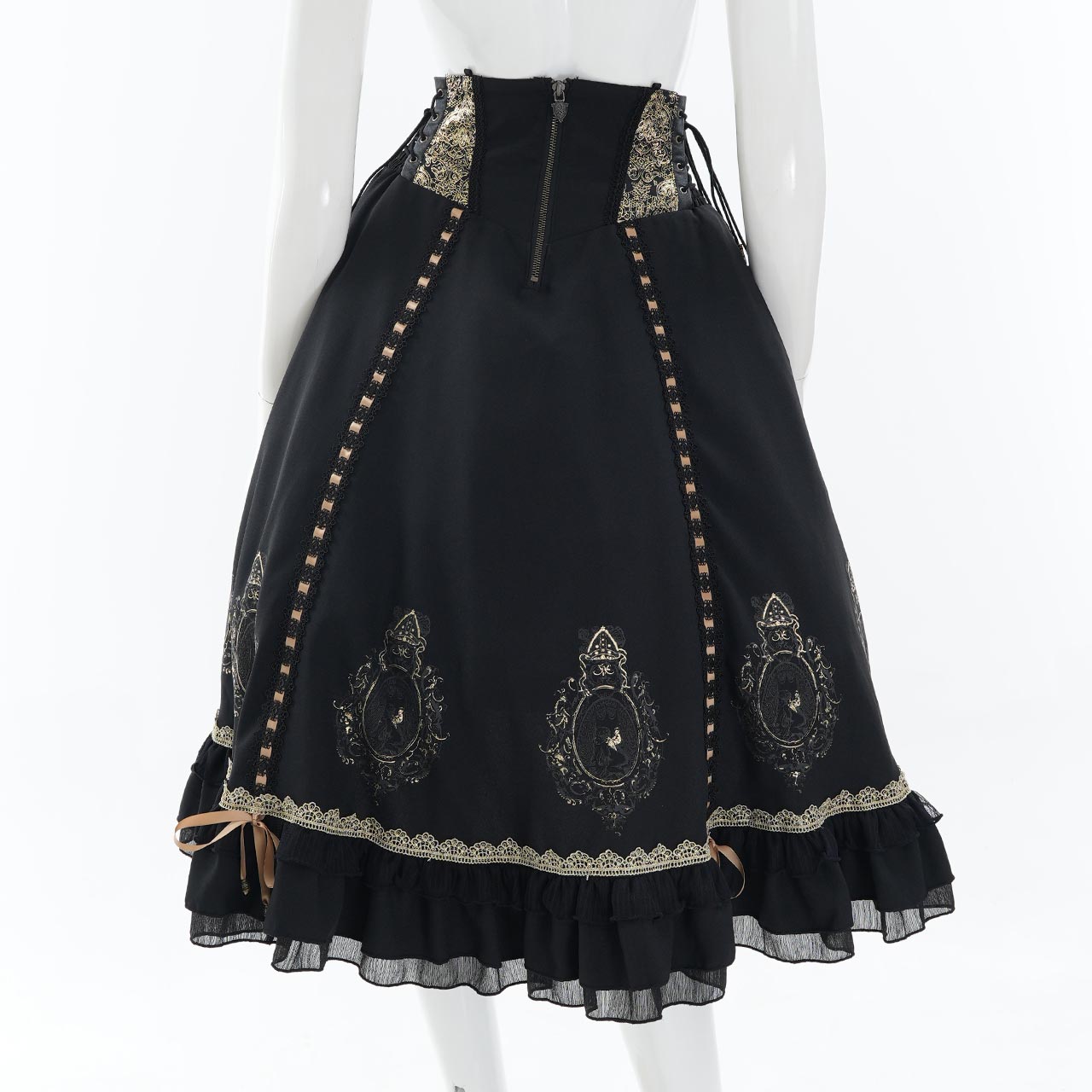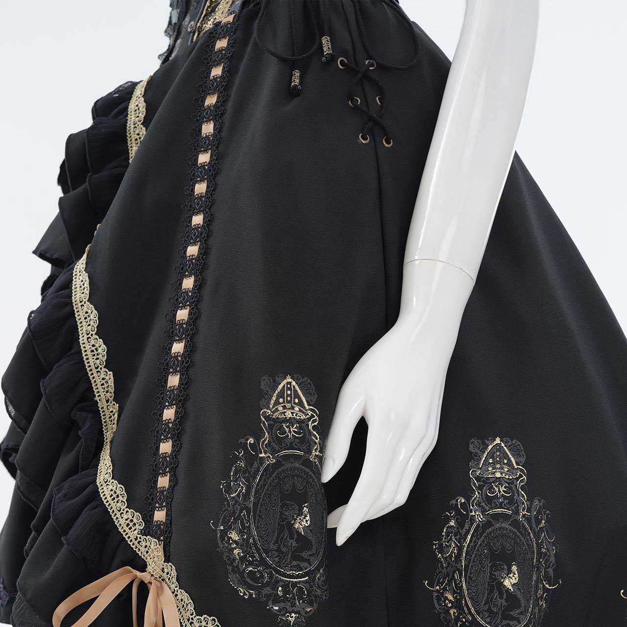 レースアップや甘めフリルが乙女心をくすぐる可憐なデザインでありながら厳かなクラシカルロリィタの要素も併せ持つ、フリルスカートです。