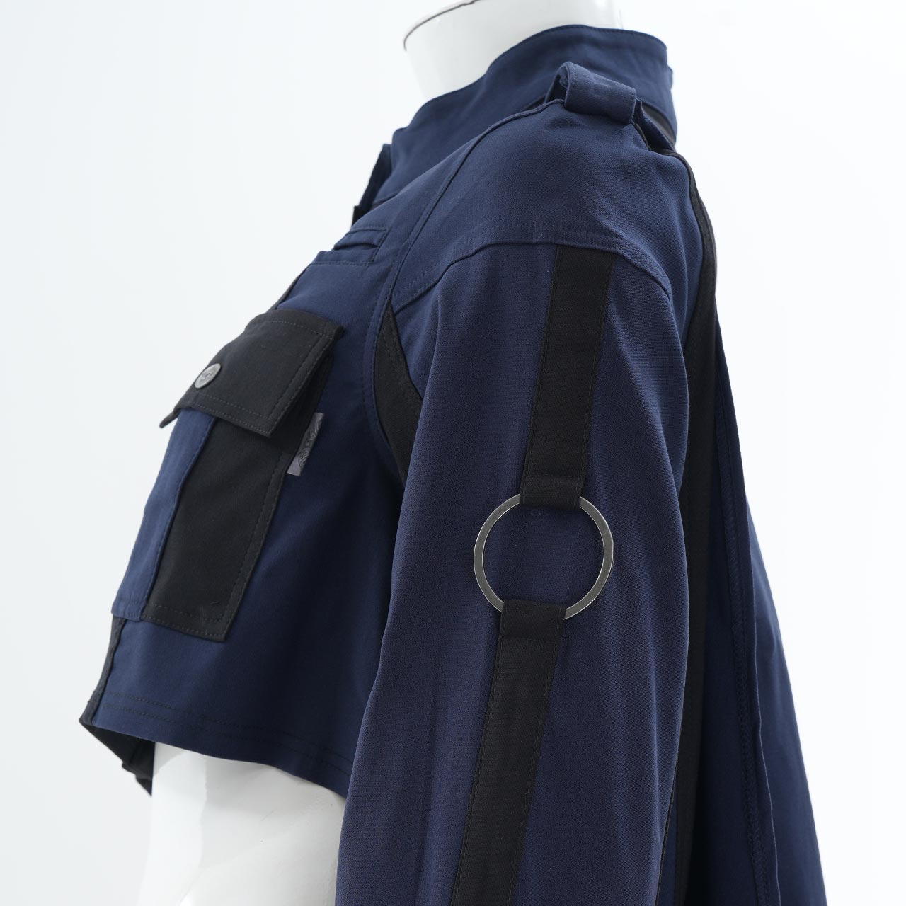 肩をシャープに見せる構築的カッティングとクロップド丈の軽さで、モードなレイヤードを引き立てるショートジャケット。
