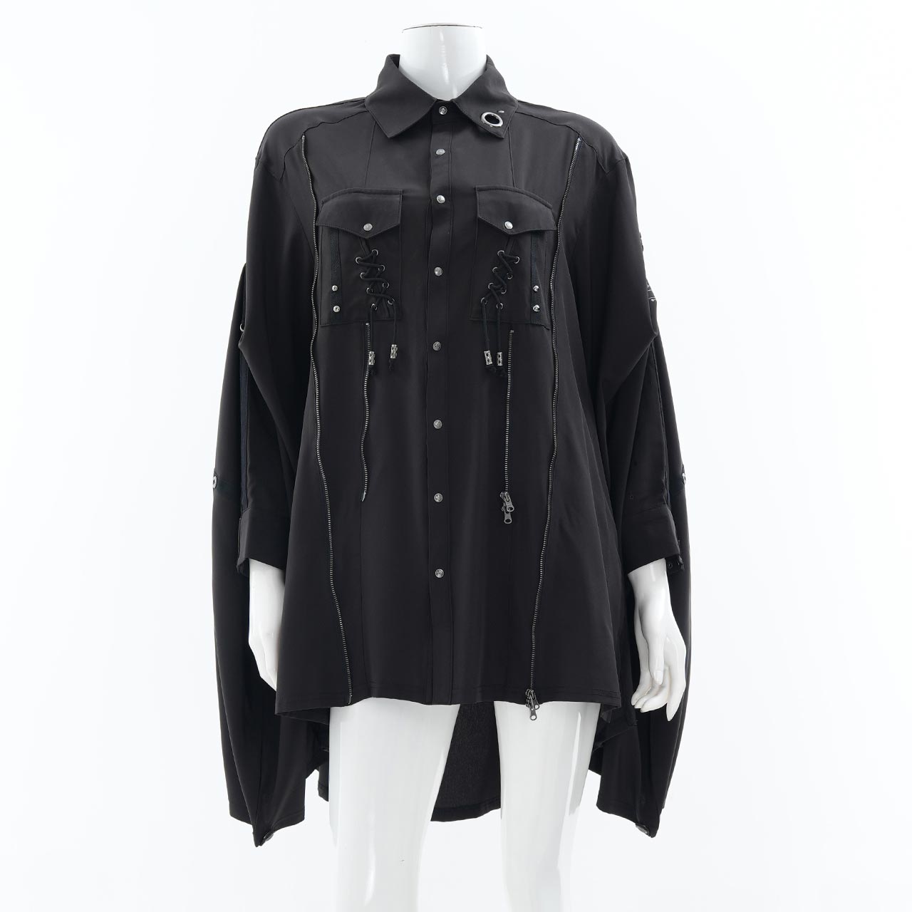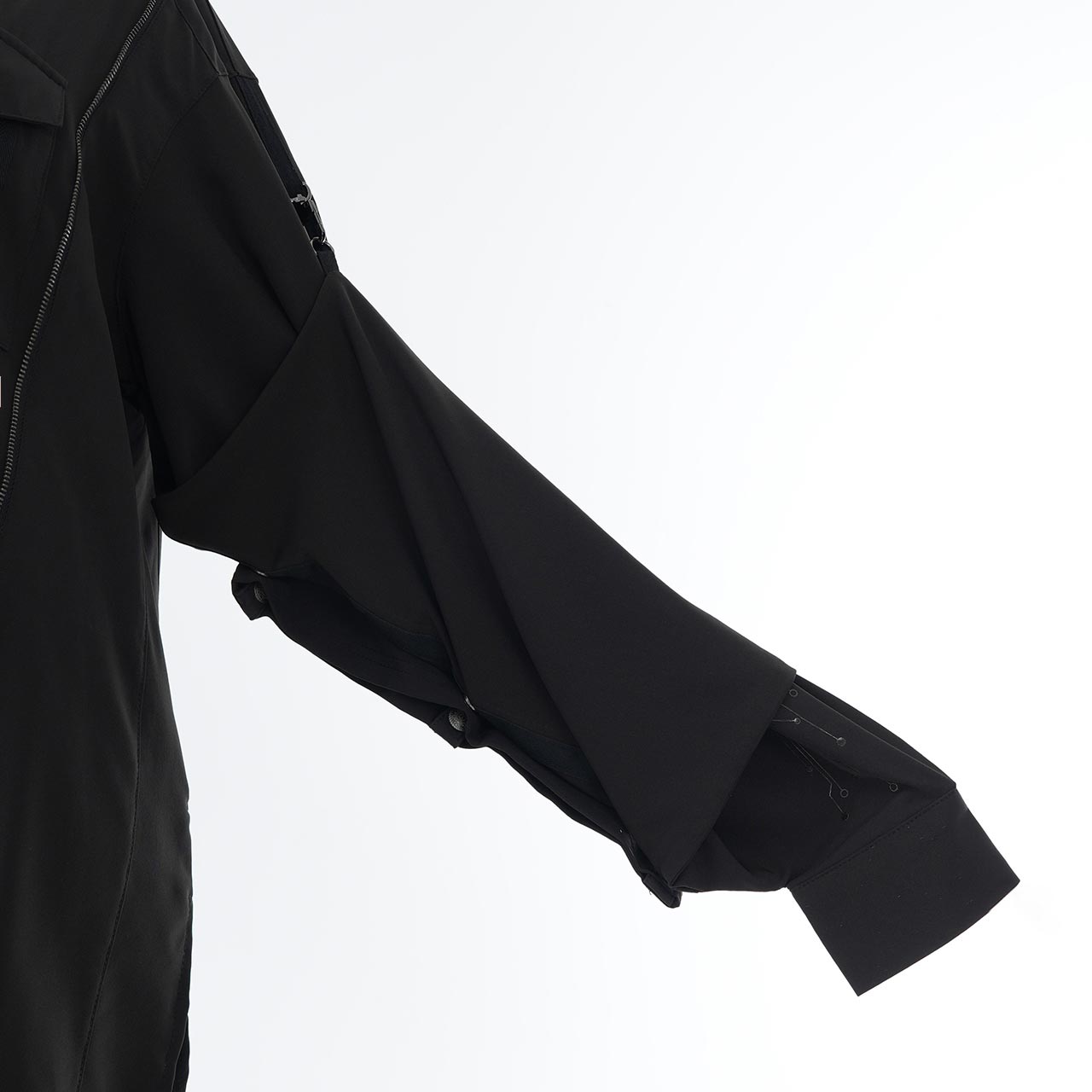 さらに、袖を巻き付けて広がりを抑えられるギミックを内蔵しており、ドラマティックなワイドスリーブからシャープなスリーブへとシルエットを可変。