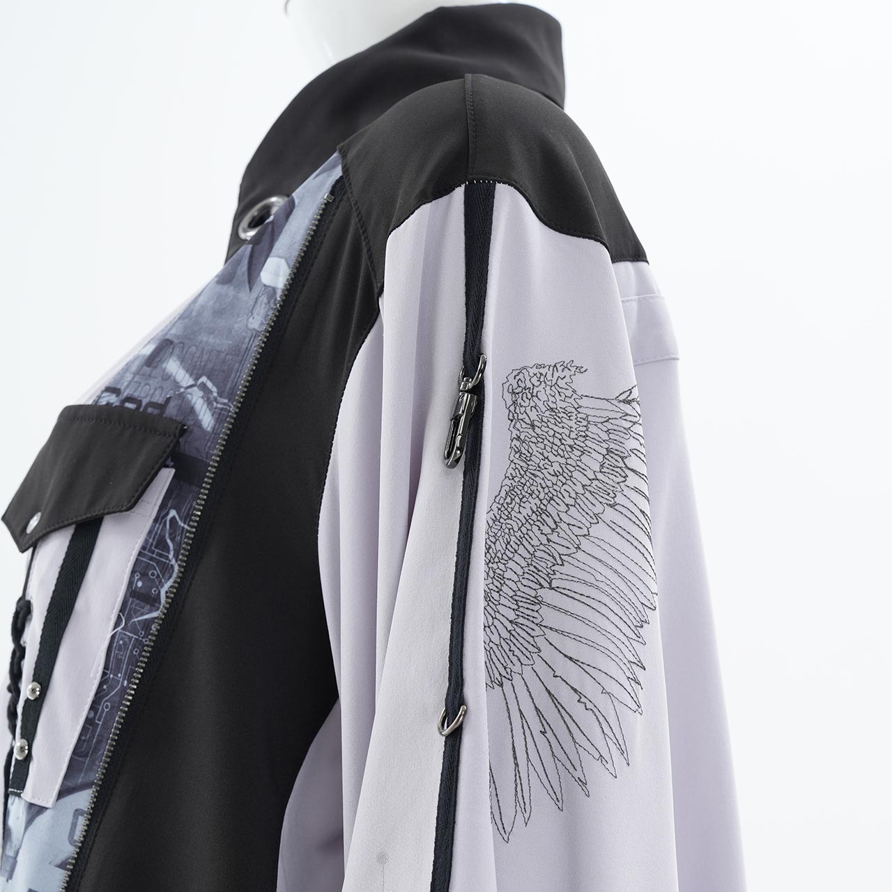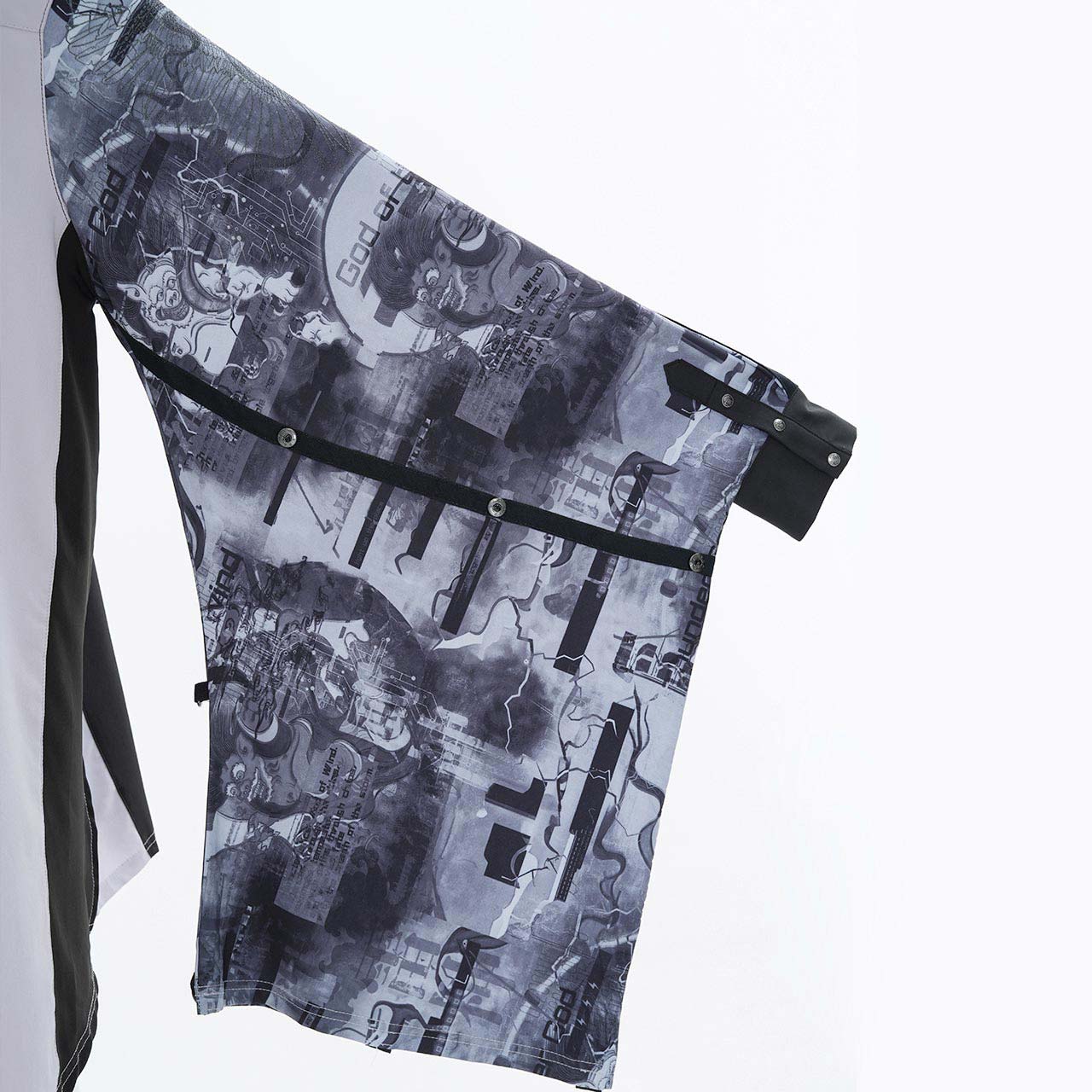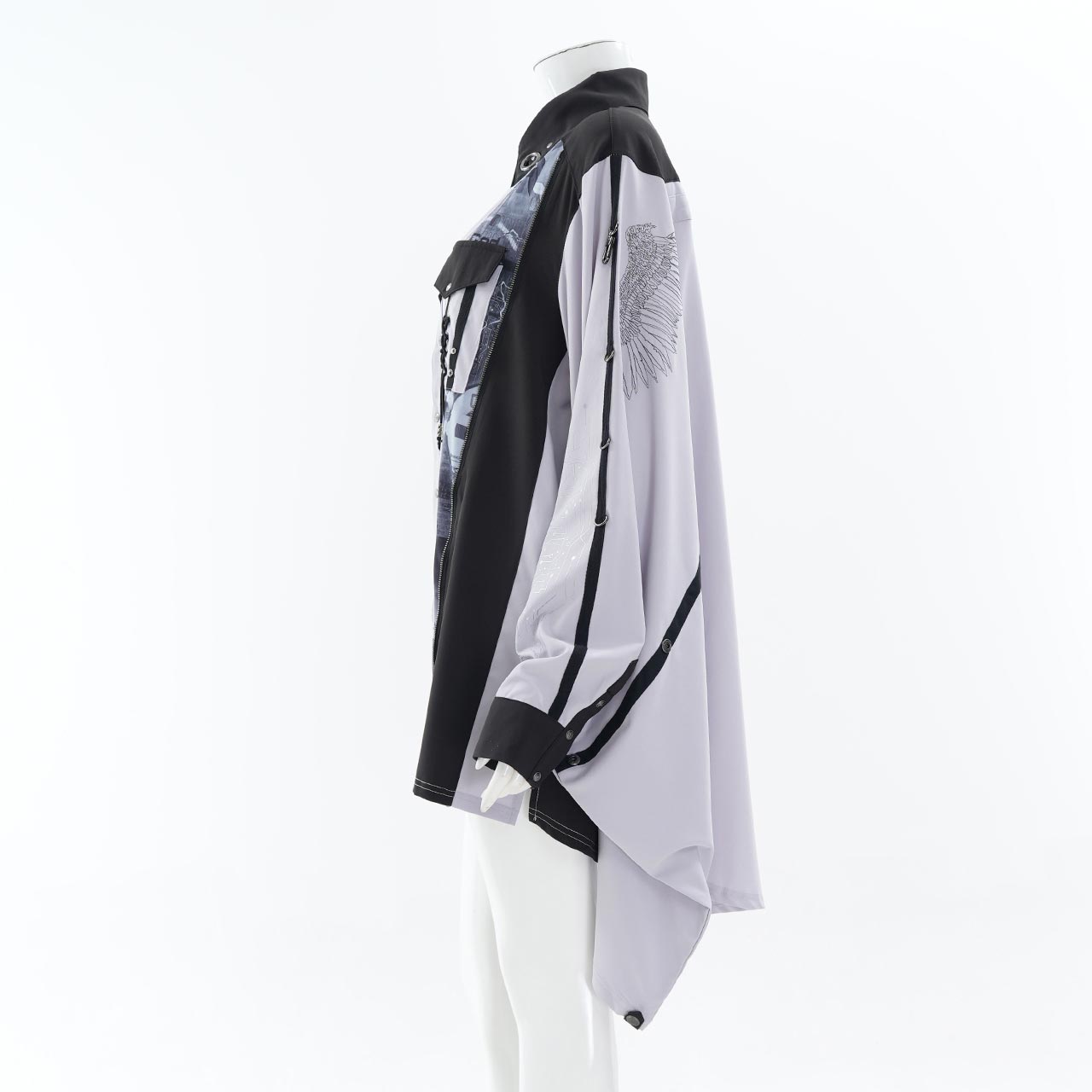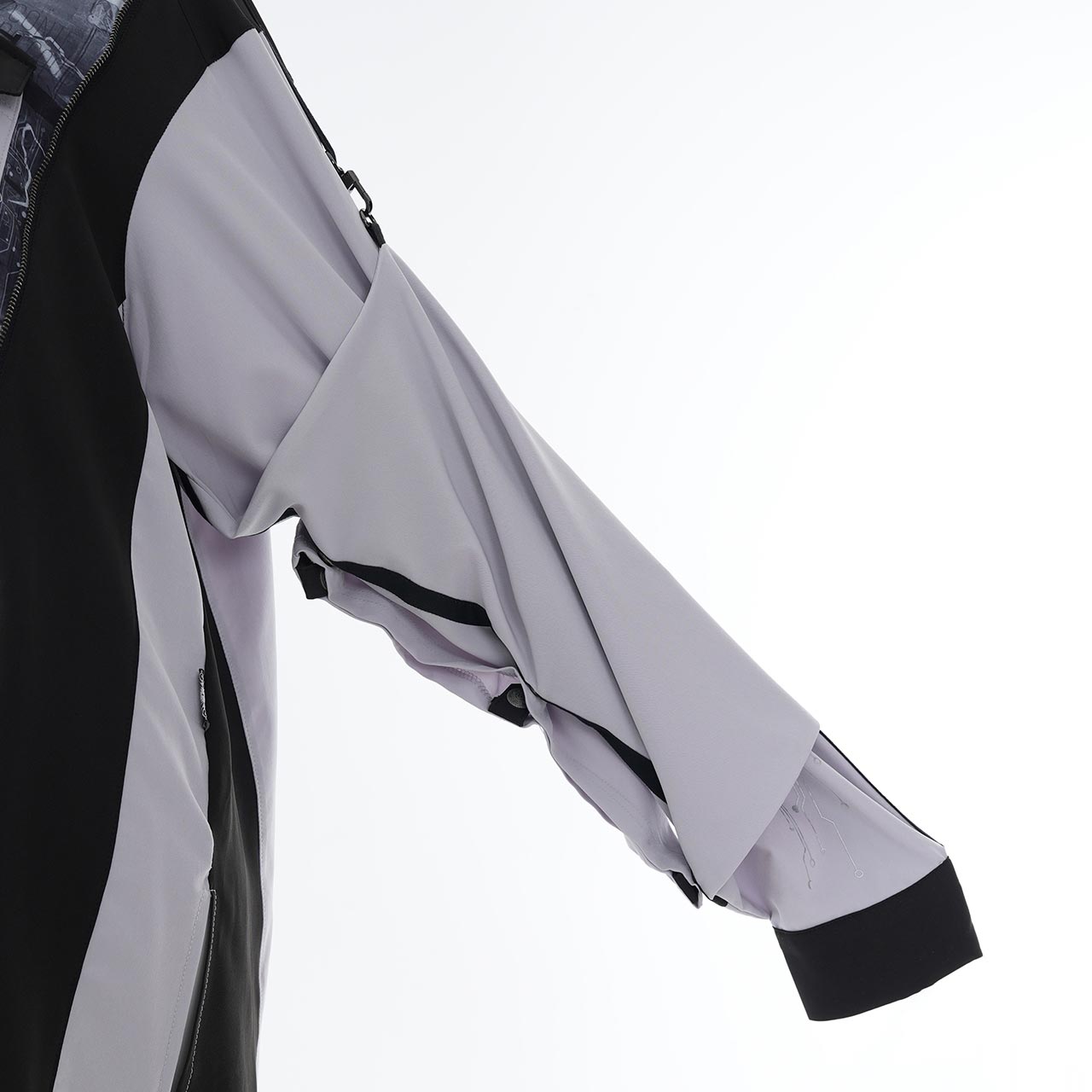 さらに、袖を巻き付けて広がりを抑えられるギミックを内蔵しており、ドラマティックなワイドスリーブからシャープなスリーブへとシルエットを可変。