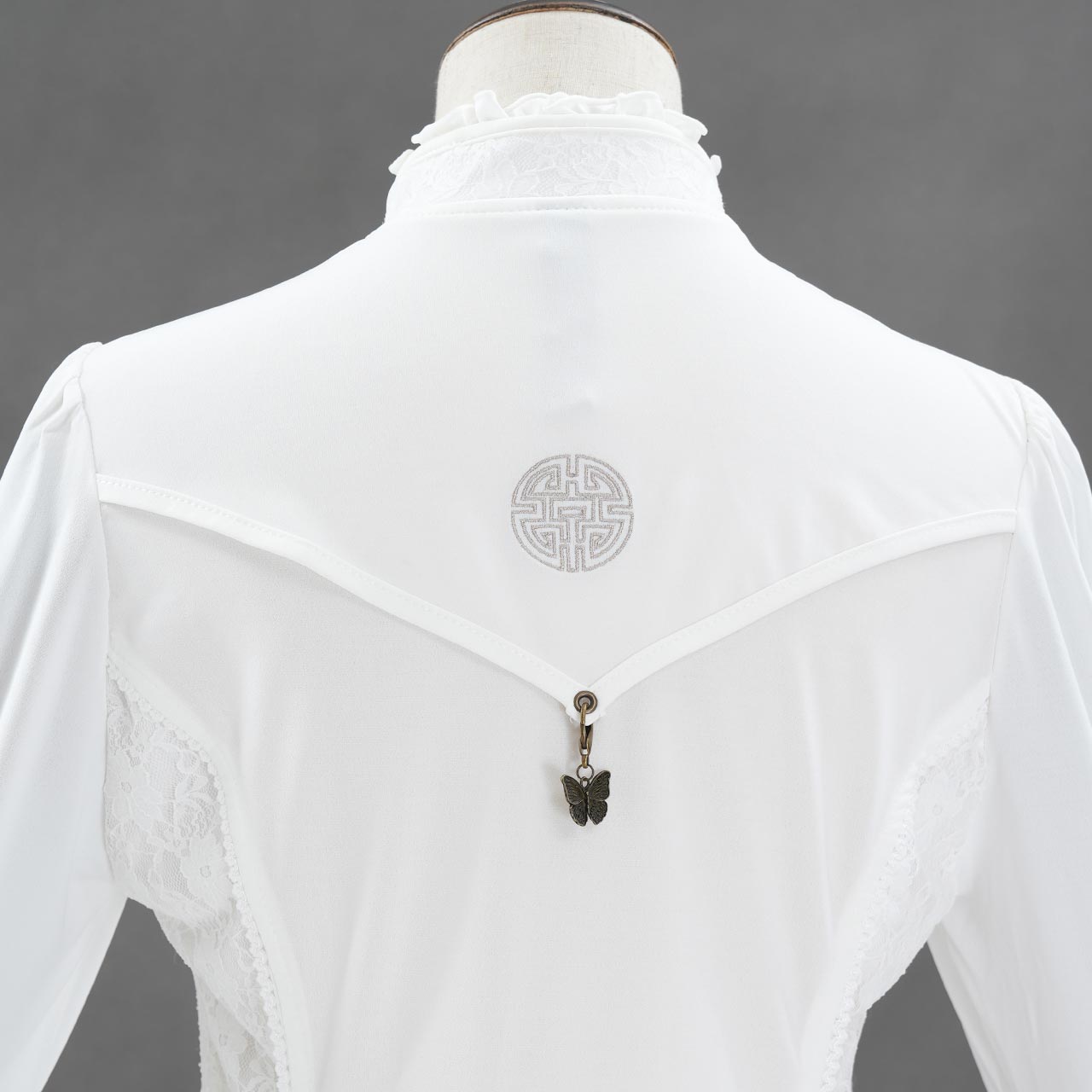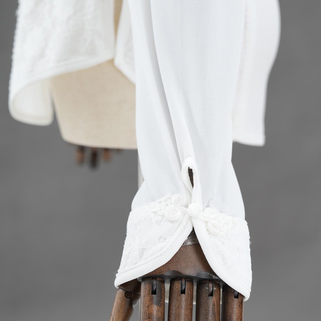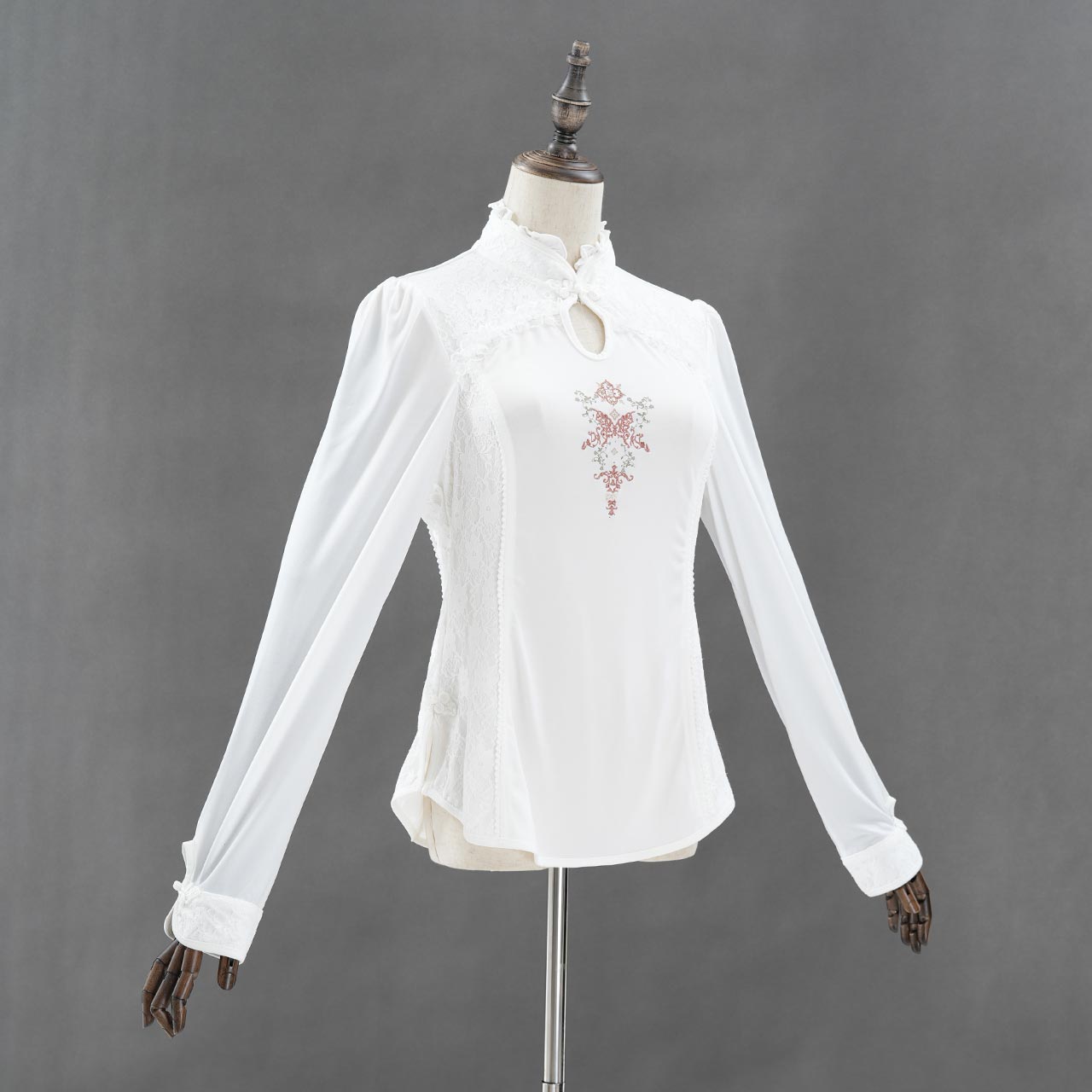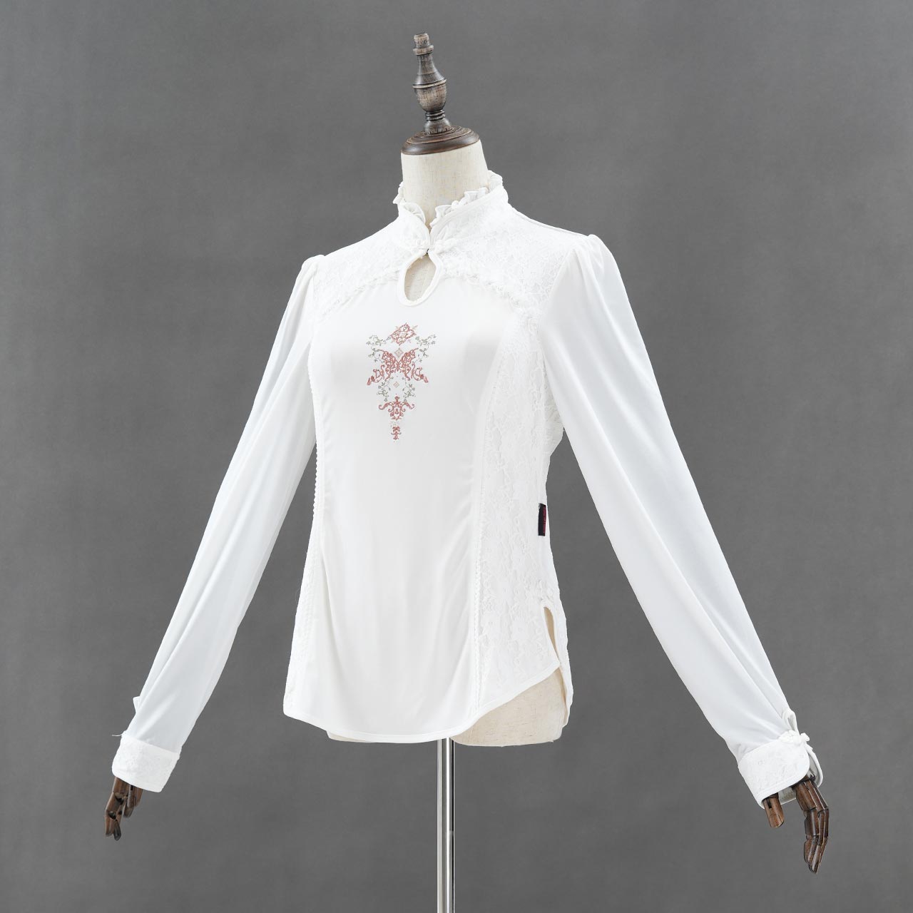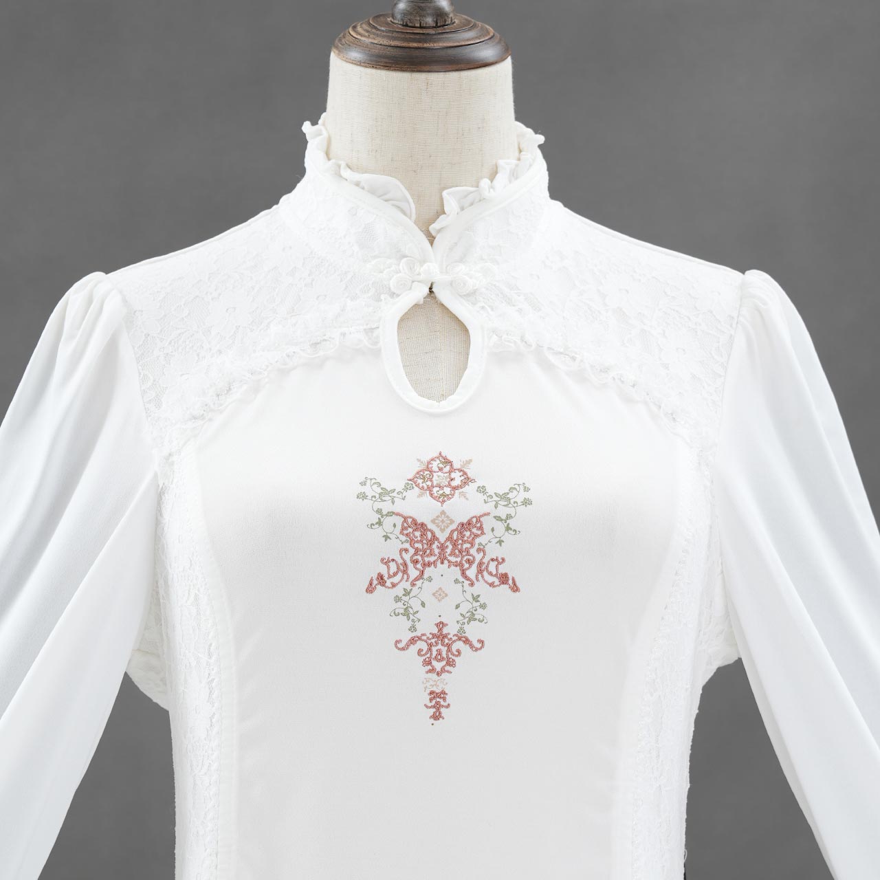胸元の刺繍とチャイナ釦が印象的で、素肌に溶け込むような透け感が上品。