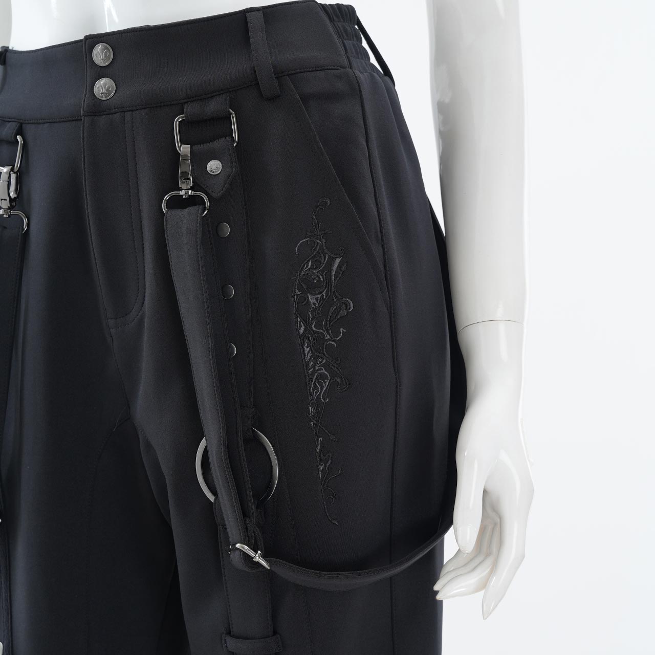 ベルトやコードのパーツワーク、裾口の表情、刺繍アクセントがミリタリー×モードのムードを引き上げます。