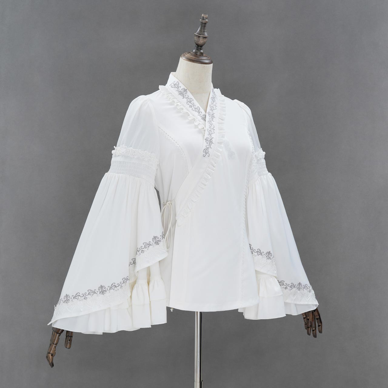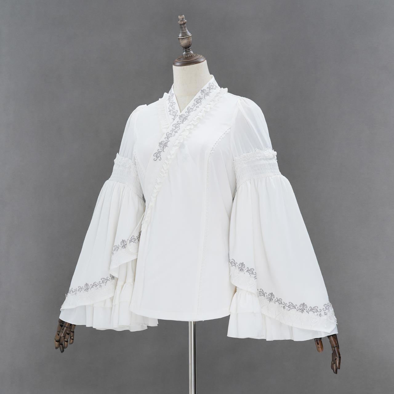 着物の前立てを思わせる打ち合わせデザインに、柔らかなレースを重ねたブラウス。