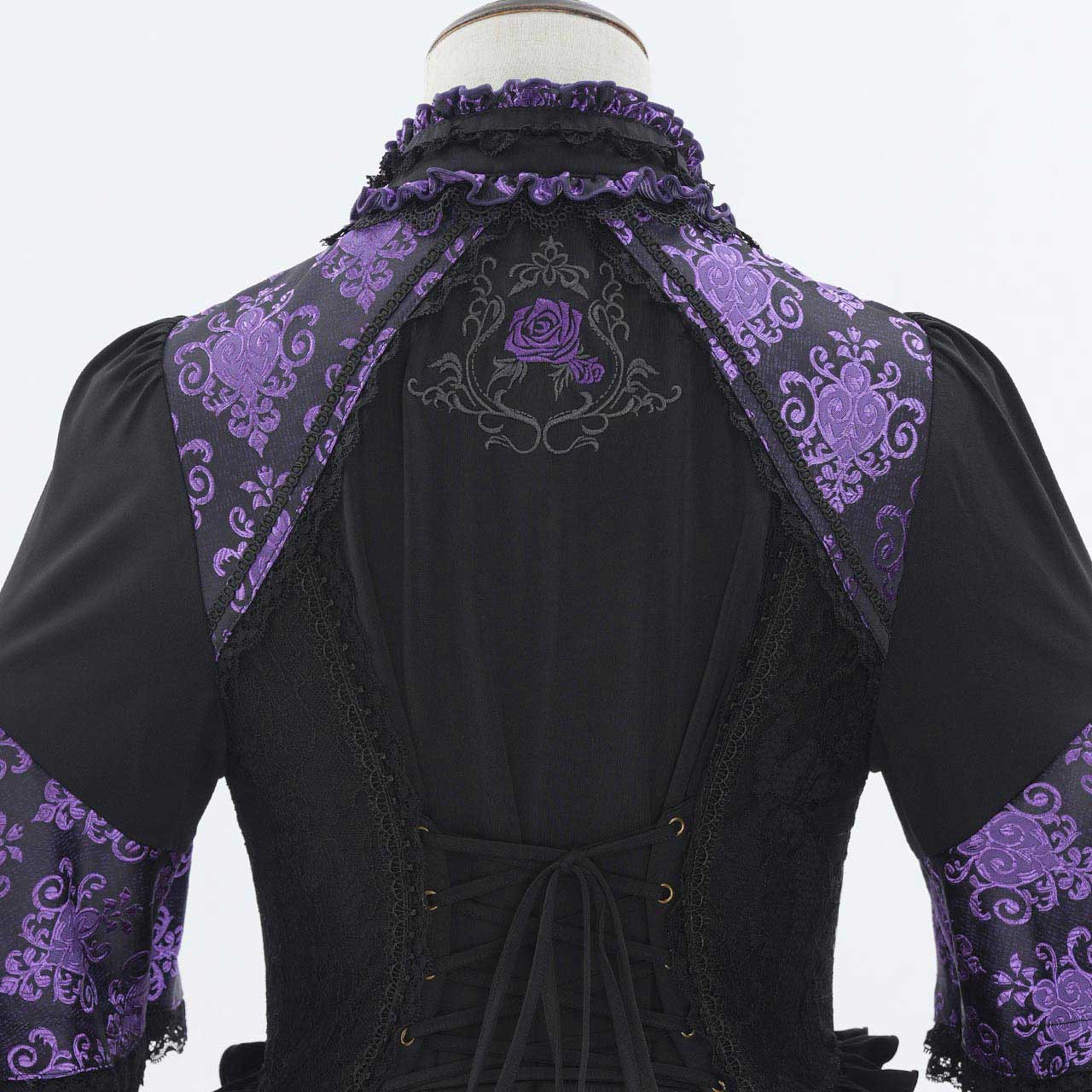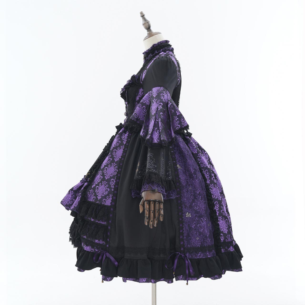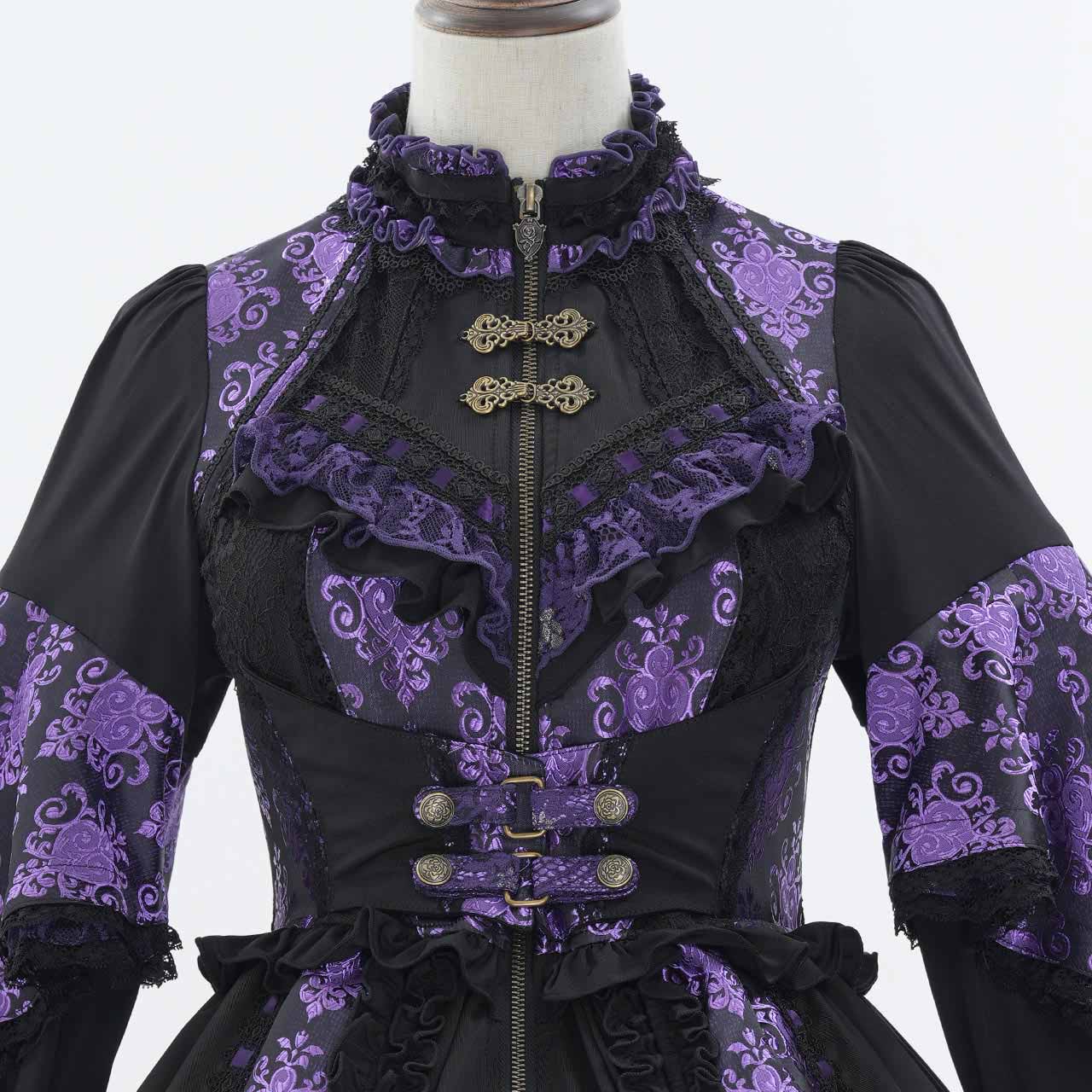 豪華なジャガード生地は高級感たっぷり。レースアップや甘めフリルが乙女心をくすぐる可憐なデザインでありながら厳かなクラシカルロリィタの要素も併せ持つ、ミステリアスなワンピースドレスです。