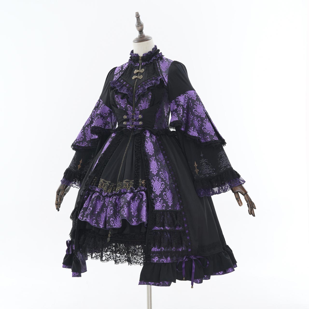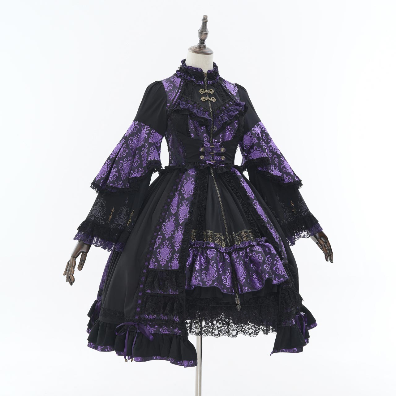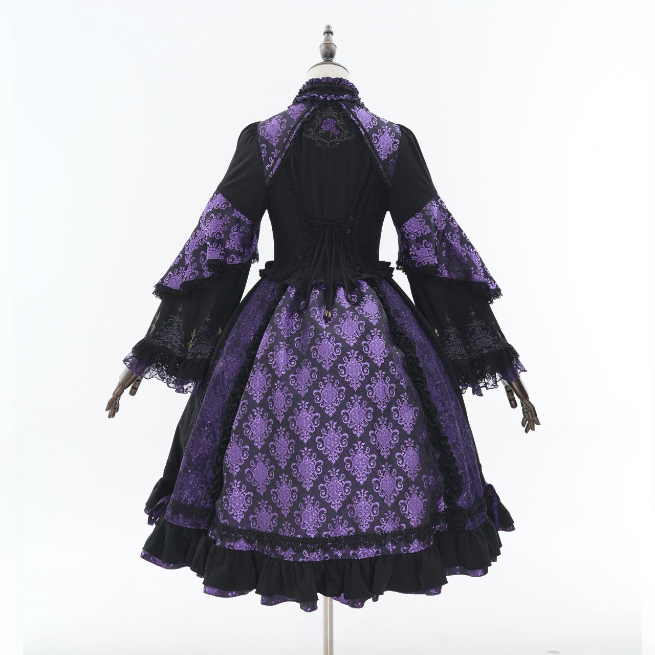 豪華なジャガード生地は高級感たっぷり。レースアップや甘めフリルが乙女心をくすぐる可憐なデザインでありながら厳かなクラシカルロリィタの要素も併せ持つ、ミステリアスなワンピースドレスです。