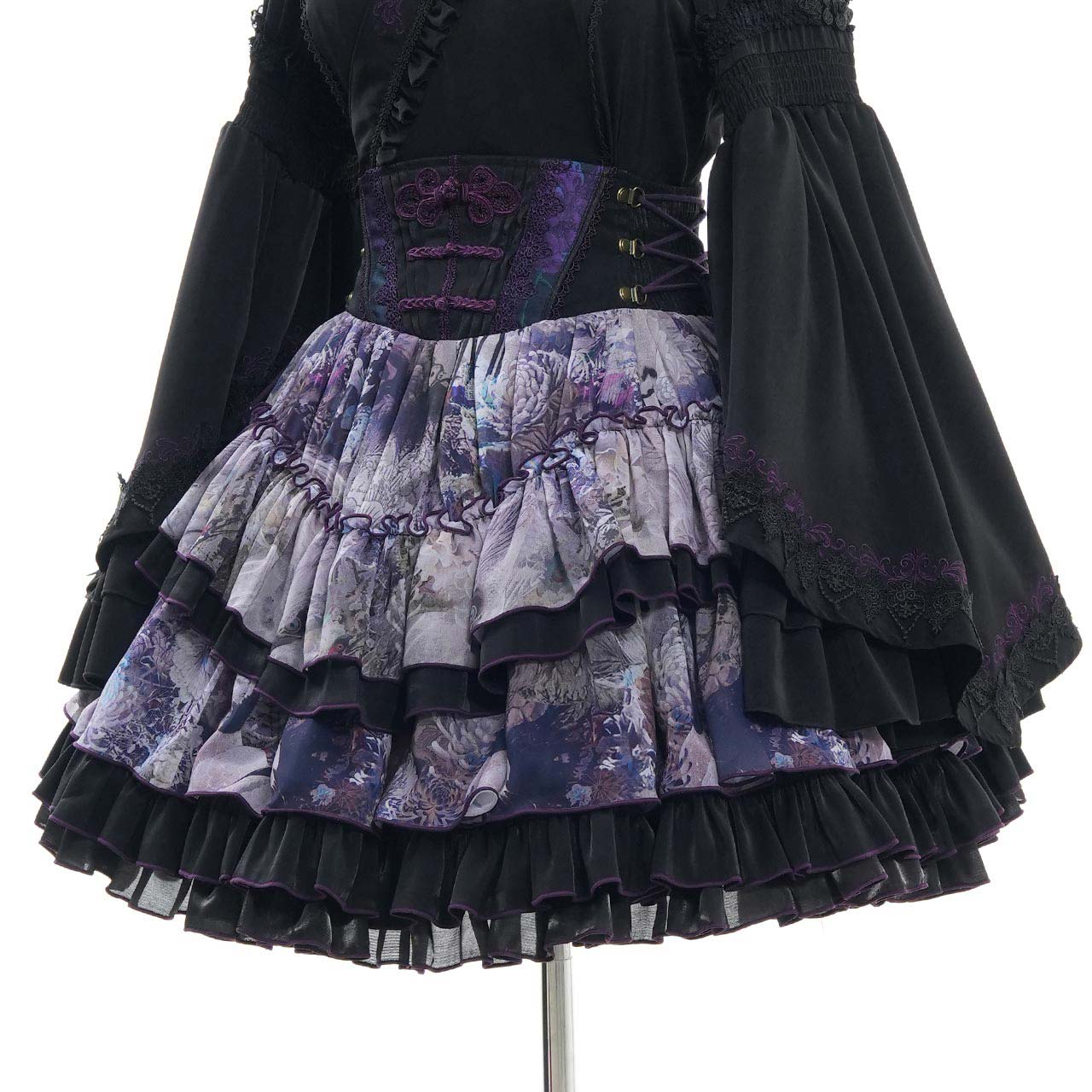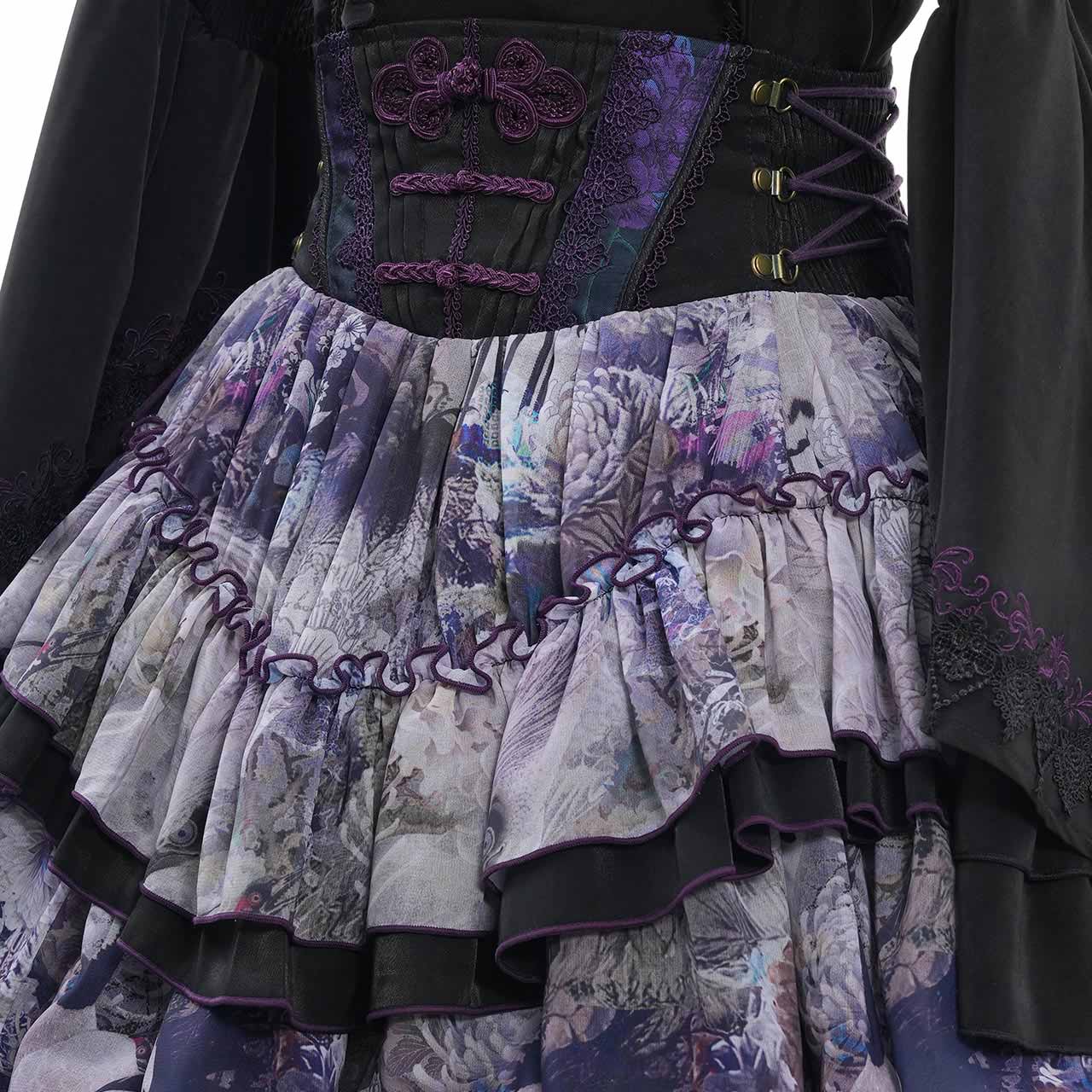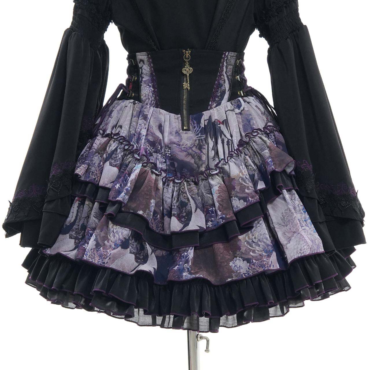 多層のフリルと総柄プリントが織りなす、儚く幻想的なスカート。