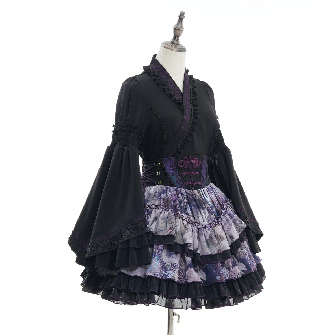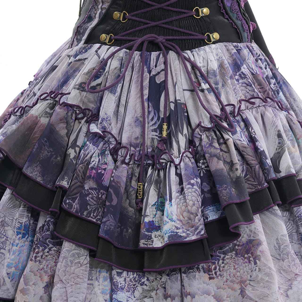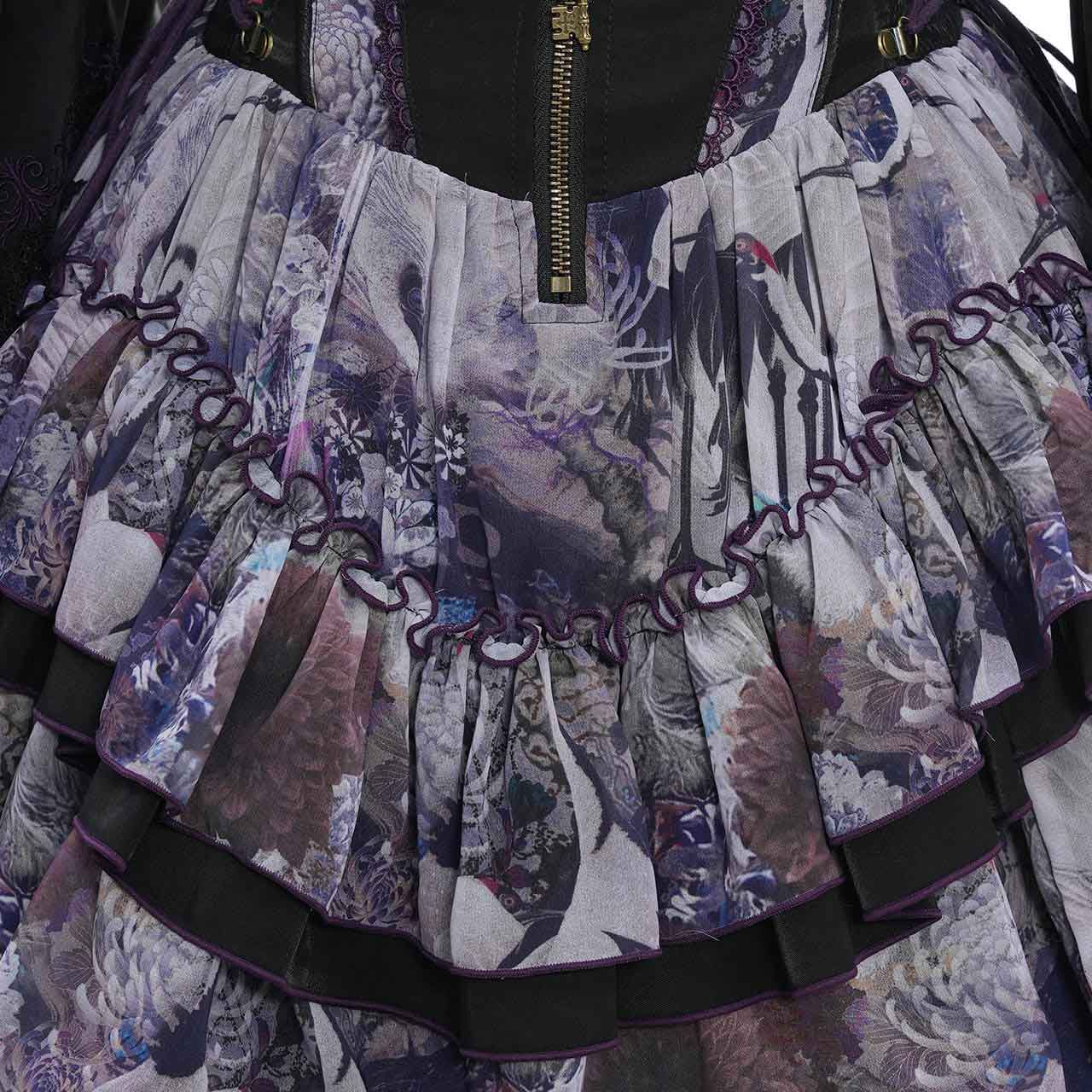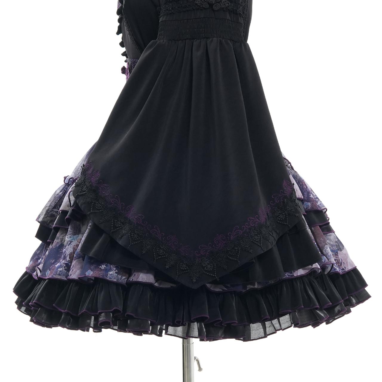 多層のフリルと総柄プリントが織りなす、儚く幻想的なスカート。