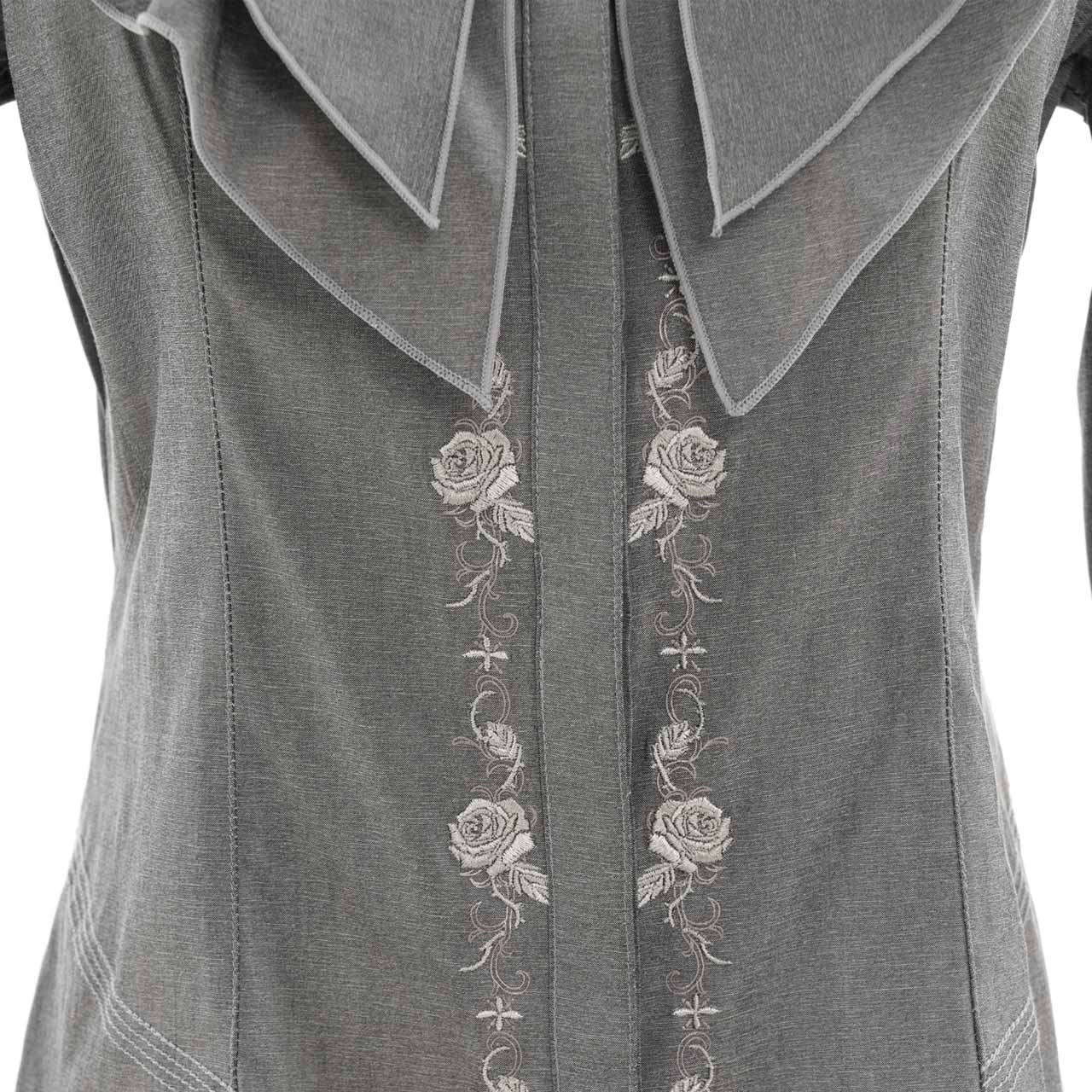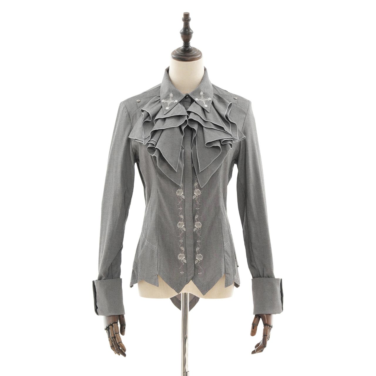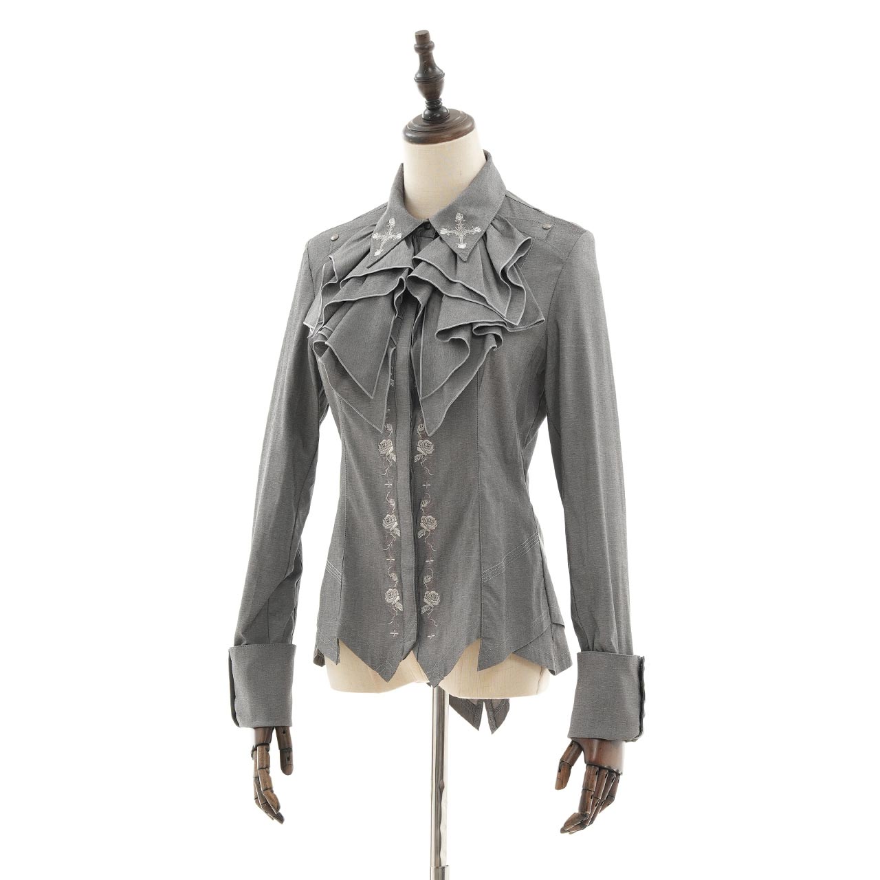 華やかなギザギザフリルデザインと、襟元に施した繊細な刺繍が印象的なブラウス。