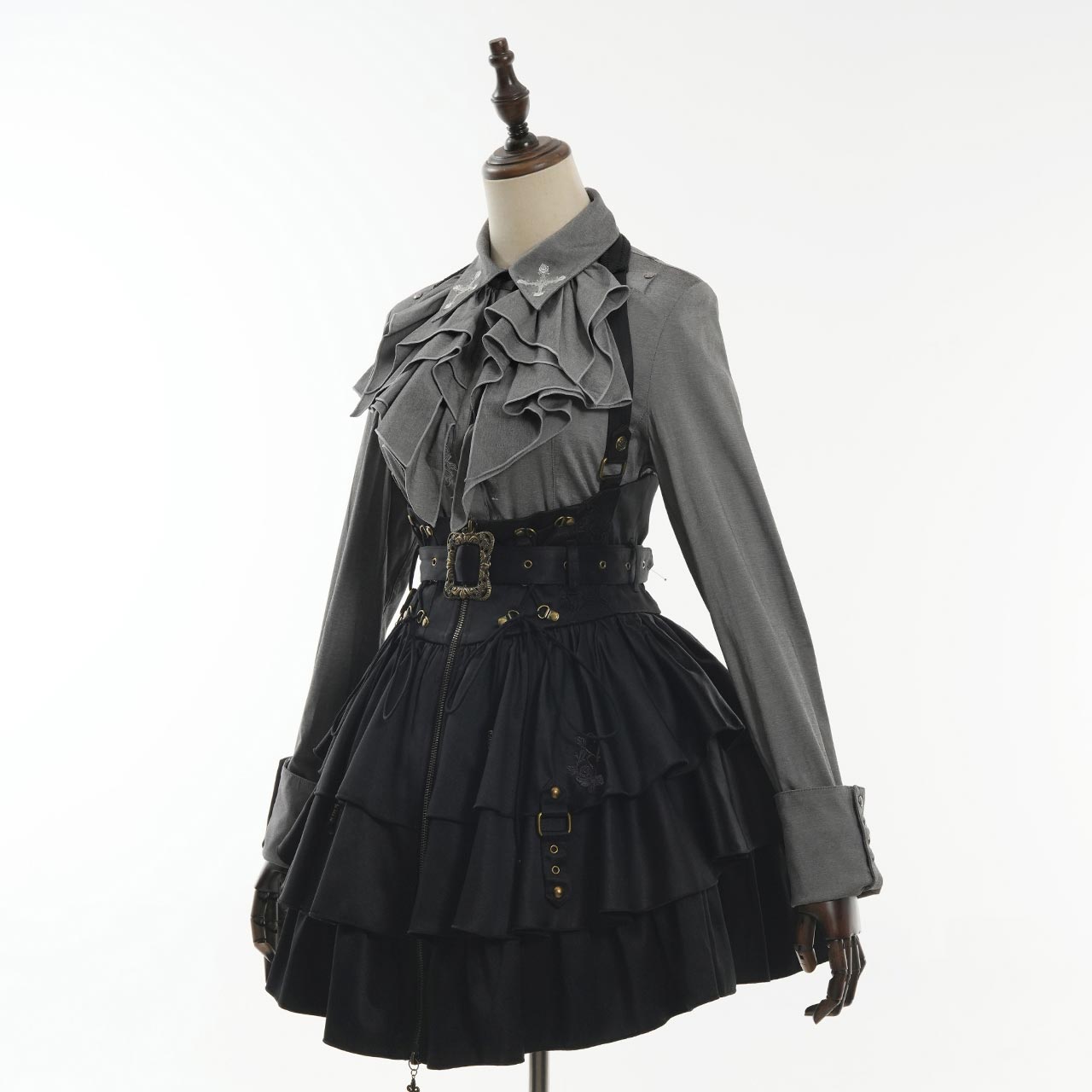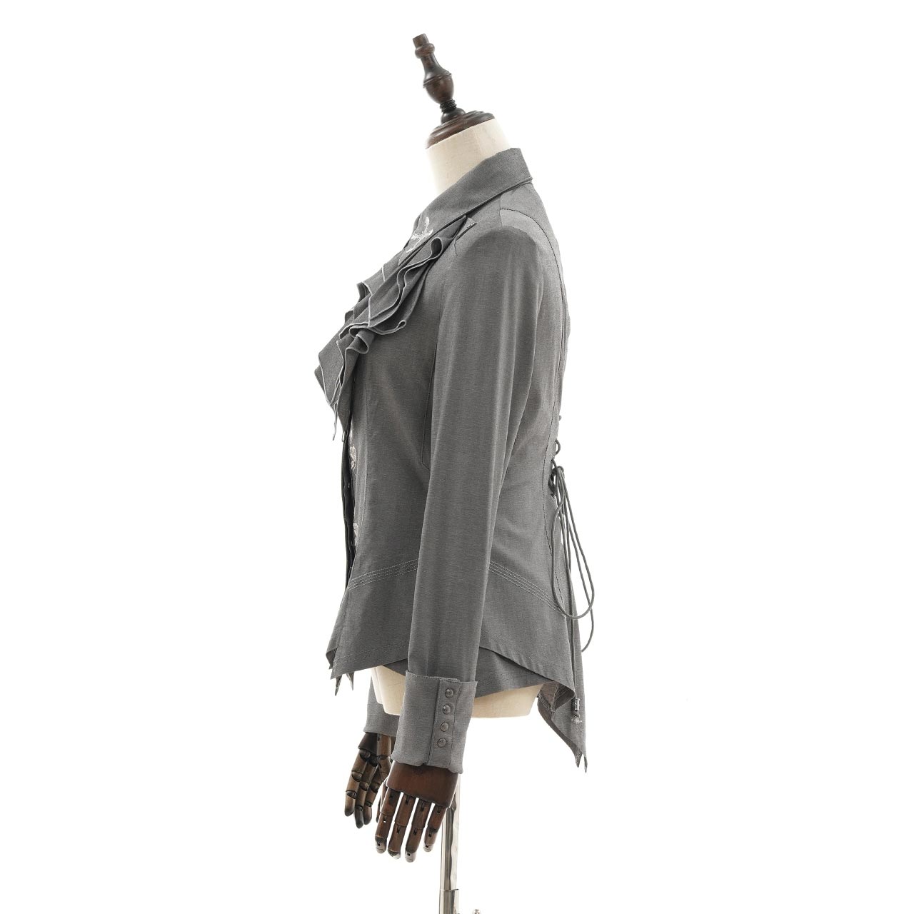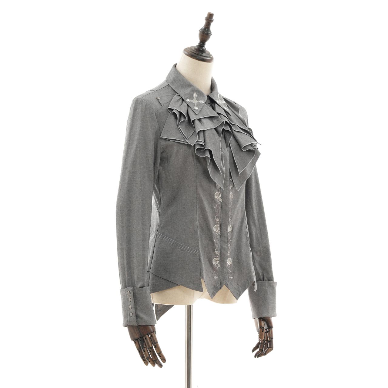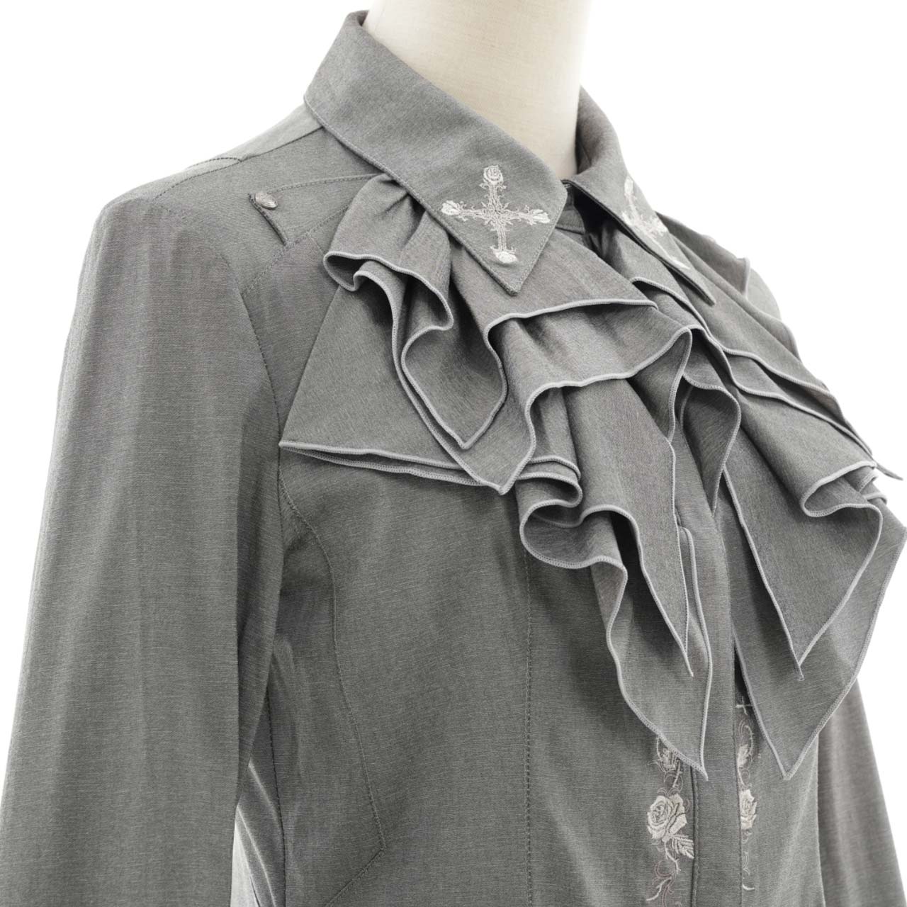 華やかなギザギザフリルデザインと、襟元に施した繊細な刺繍が印象的なブラウス。
