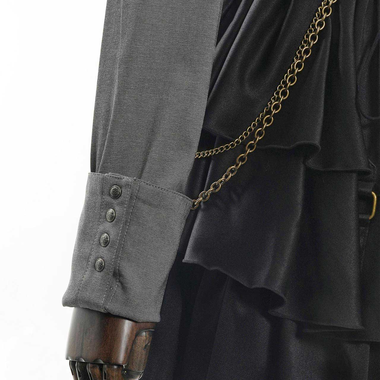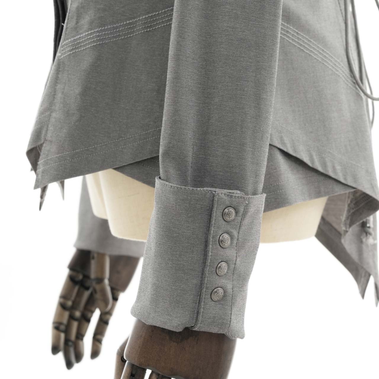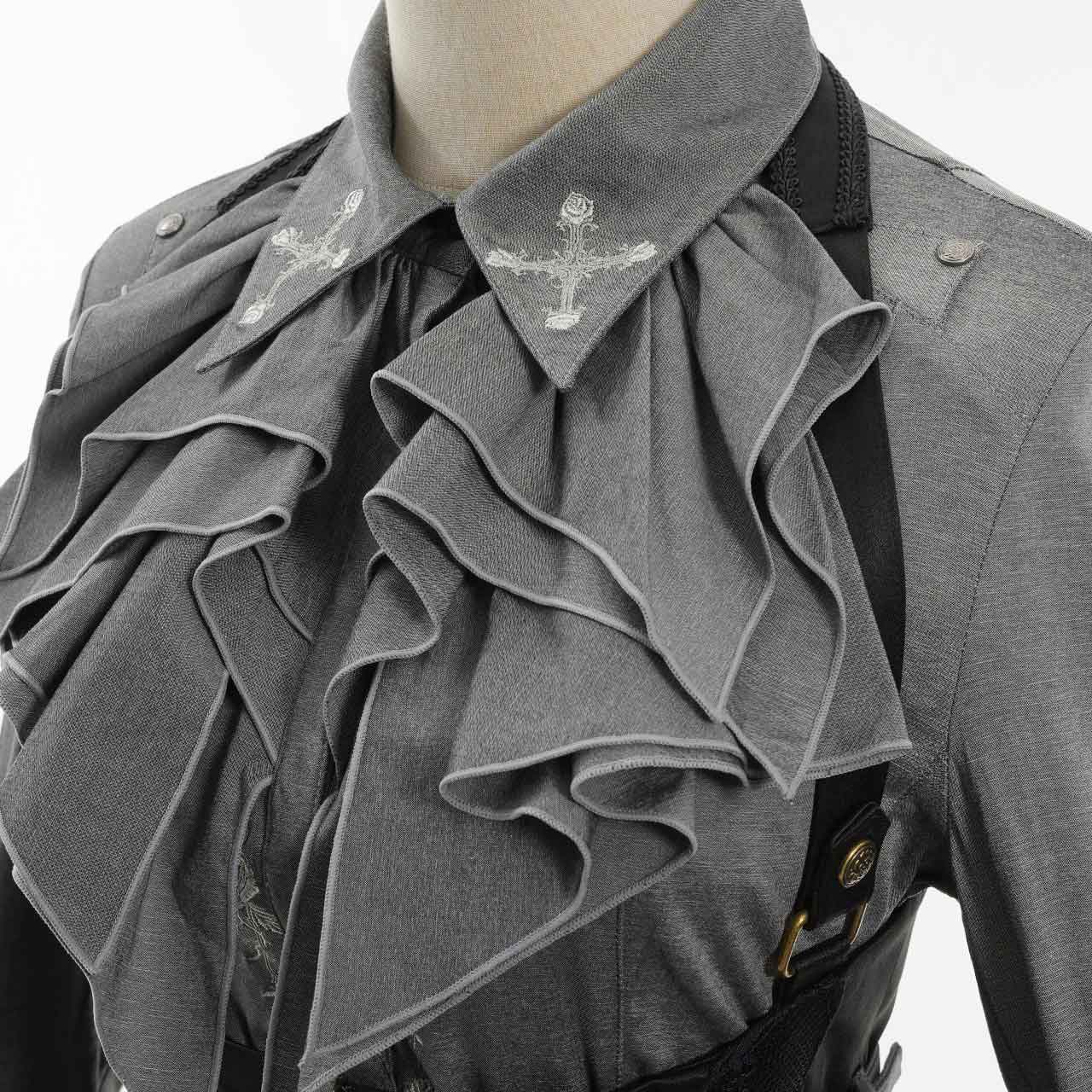 肩のメタルボタンや、フロントに流れる刺繍ディテールがアクセントとなり、上品さと個性を両立。