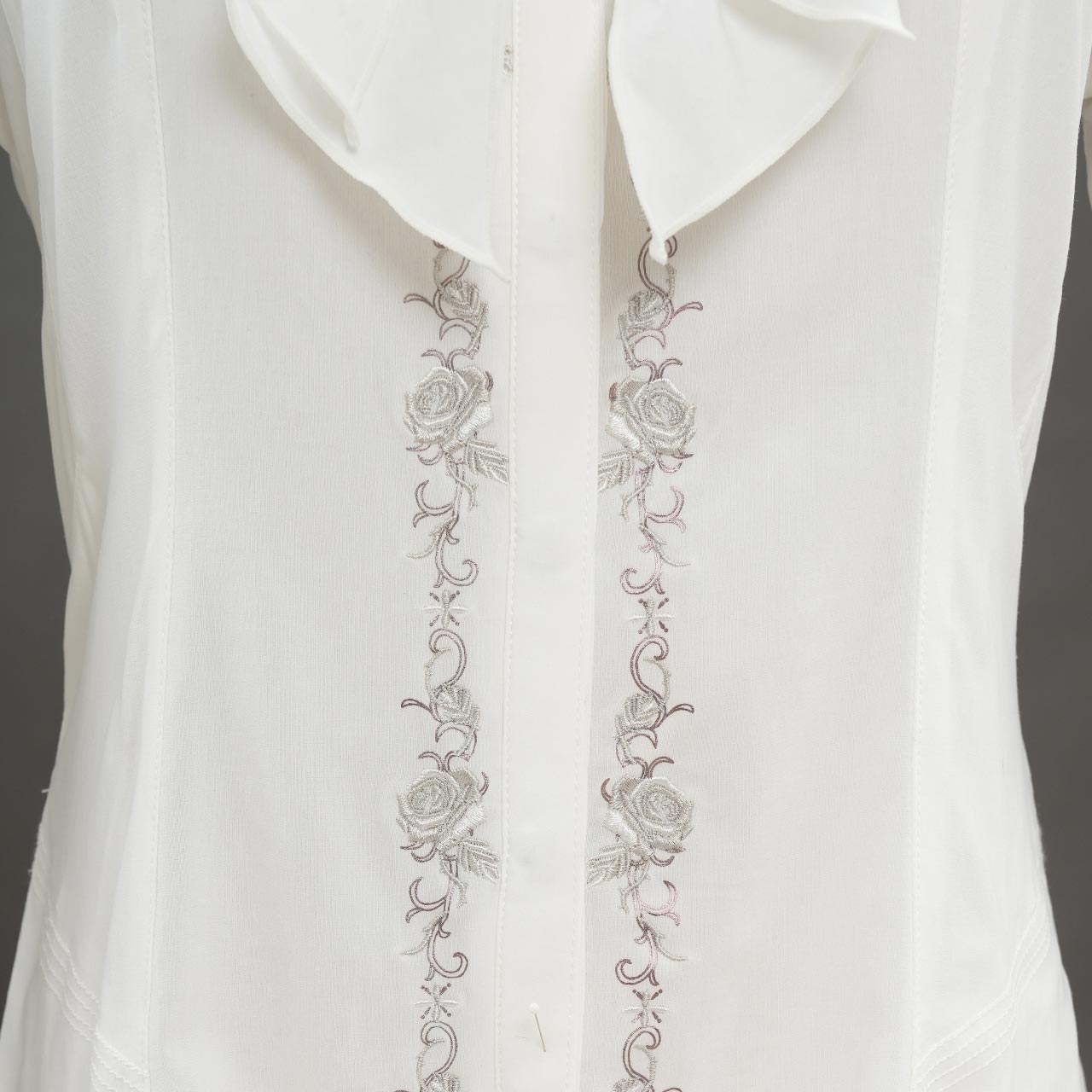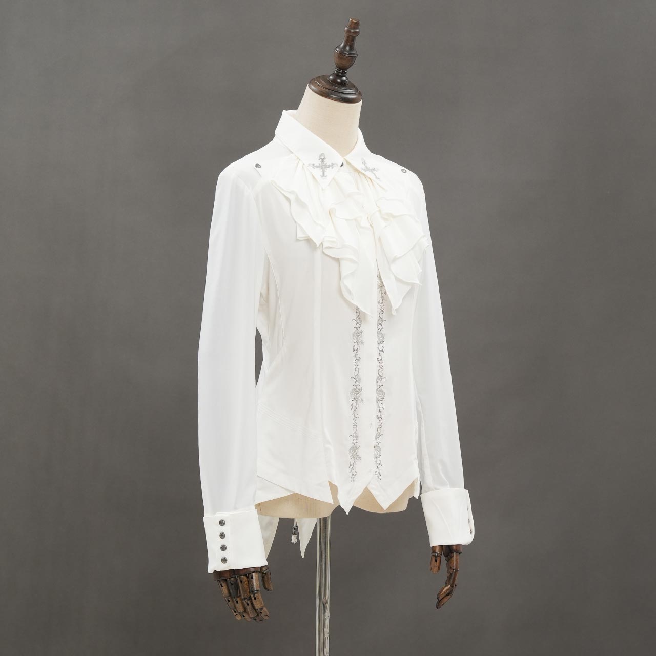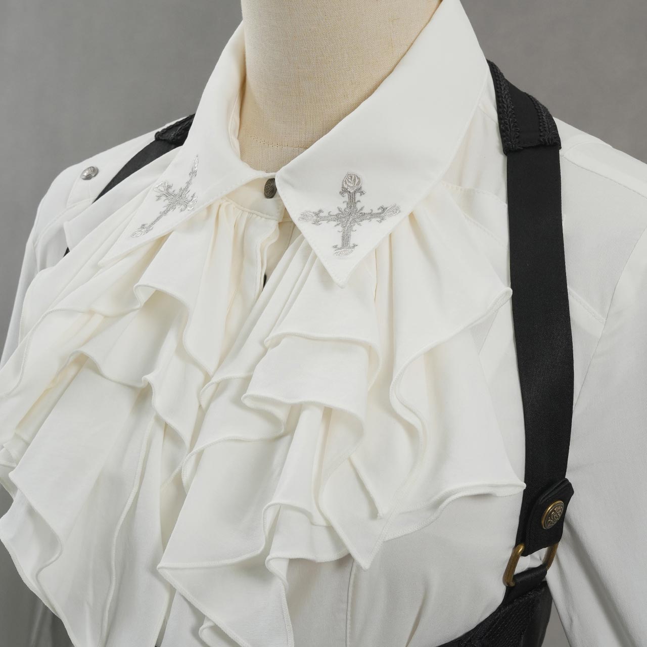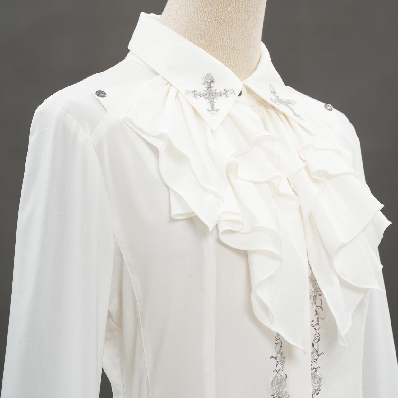 華やかなギザギザフリルデザインと、襟元に施した繊細な刺繍が印象的なブラウス。
