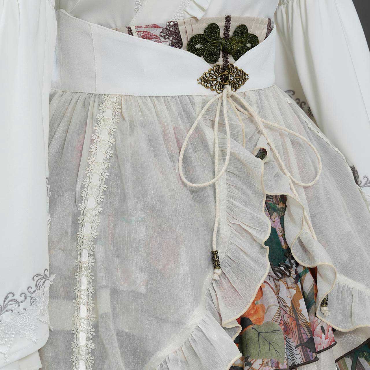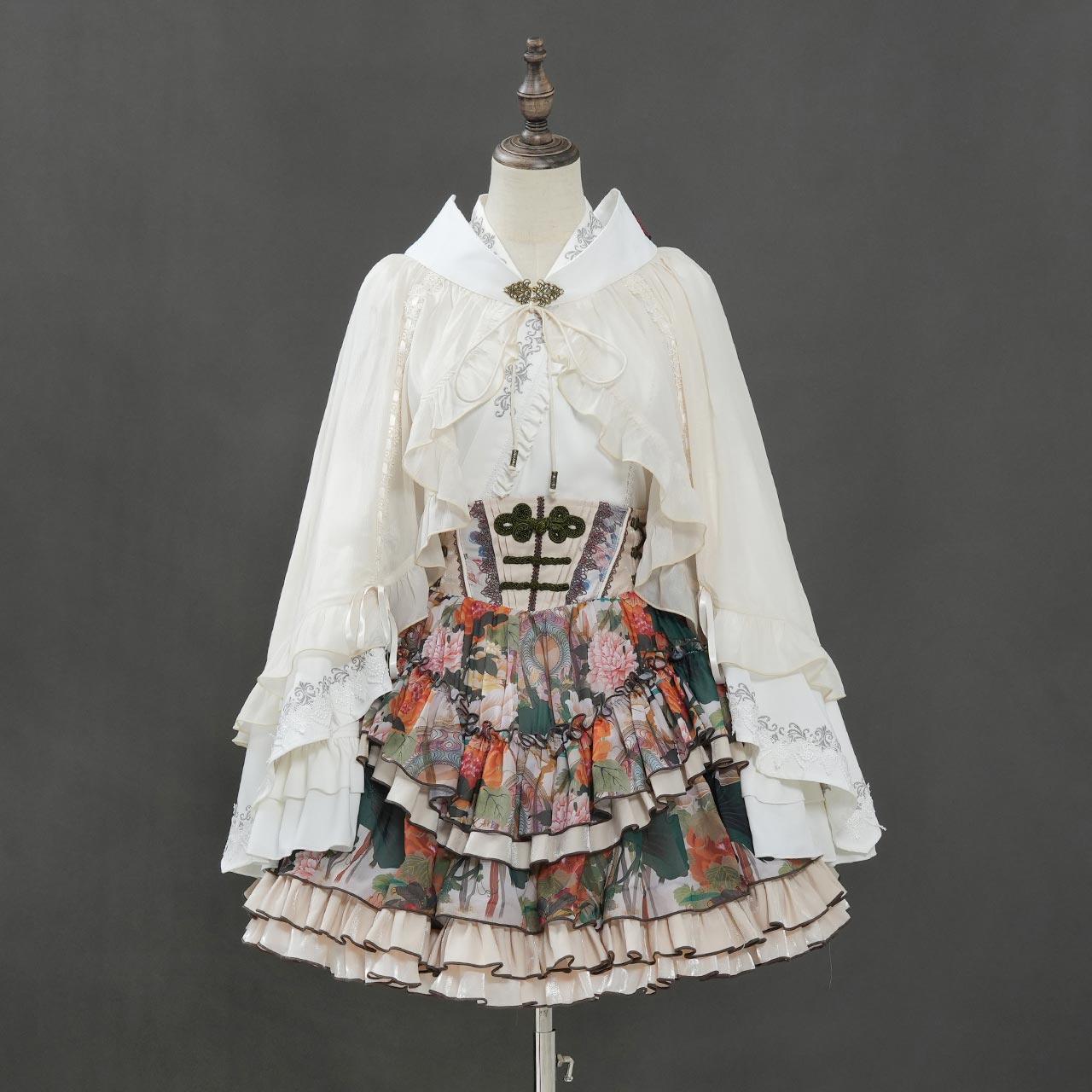 軽やかな透け感が重ねたスカートを柔らかく包み込み、光を受けるたびに淡く輝きを変えます。