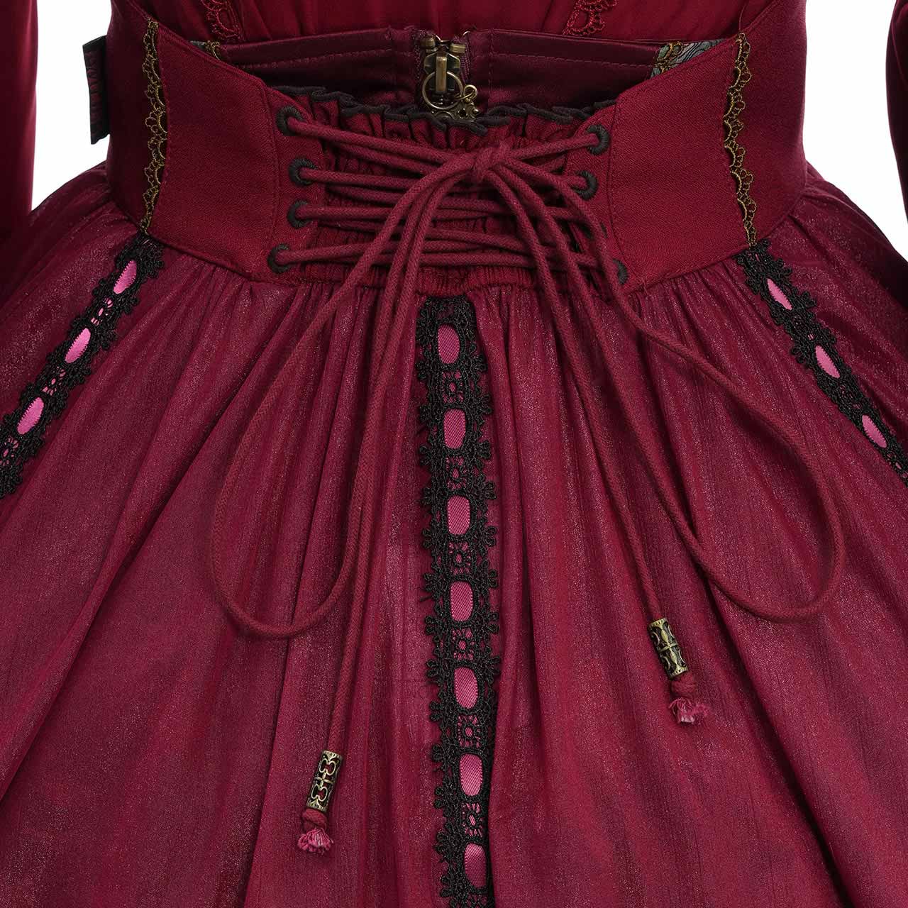 はしごレースに通したリボンが前後に配置され、リボンを結ぶと、波打つようなドレープが現れ、長さや広がりを自在にアレンジ可能。