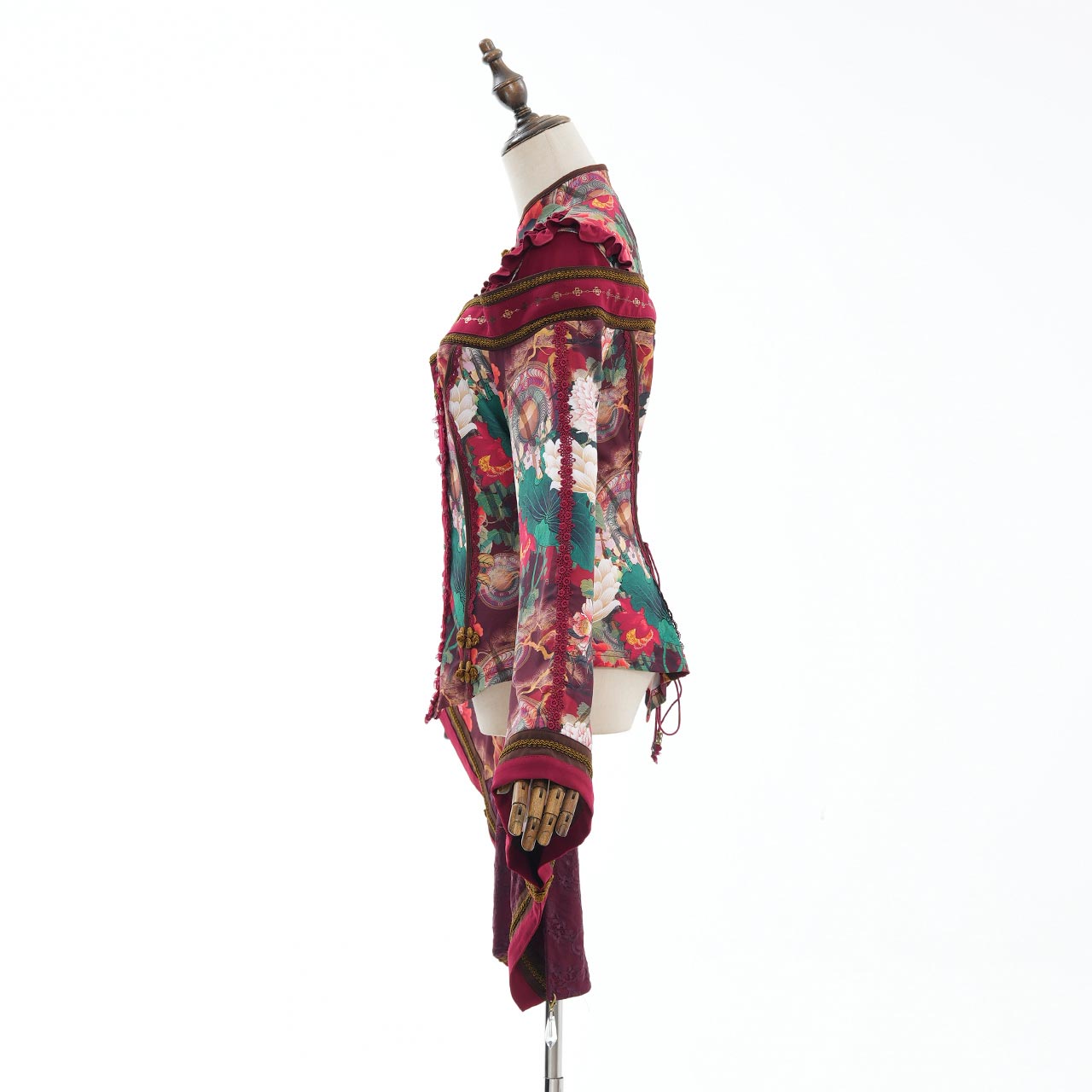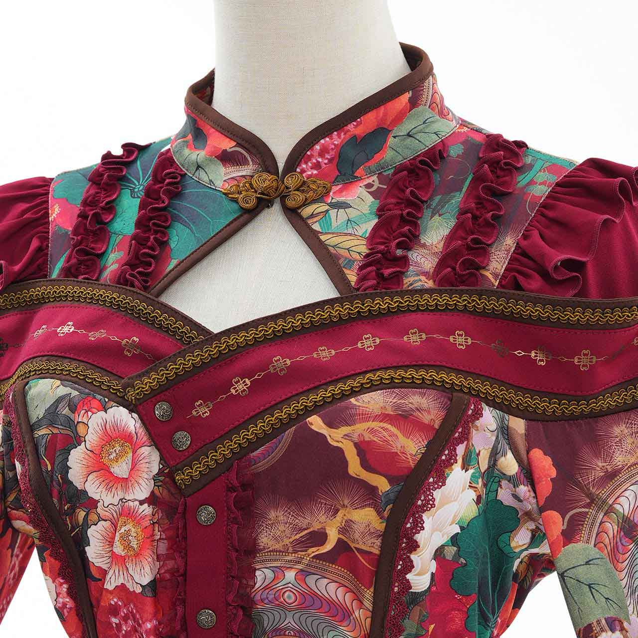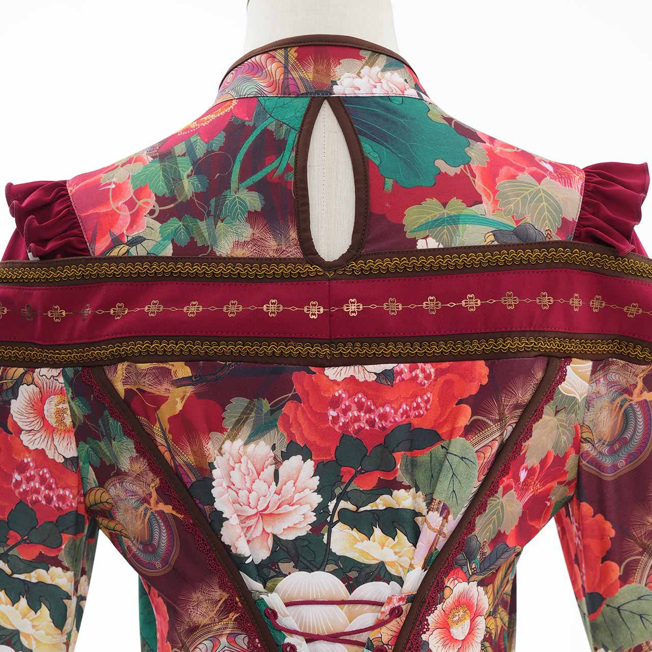 胸元の着物風デザインとチャイナ釦がアクセントとなり、シルエットに引き締まりを与えています。