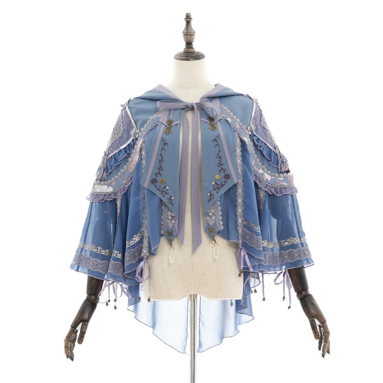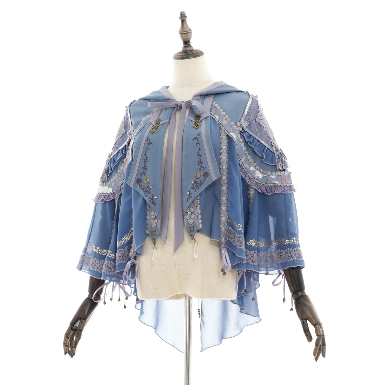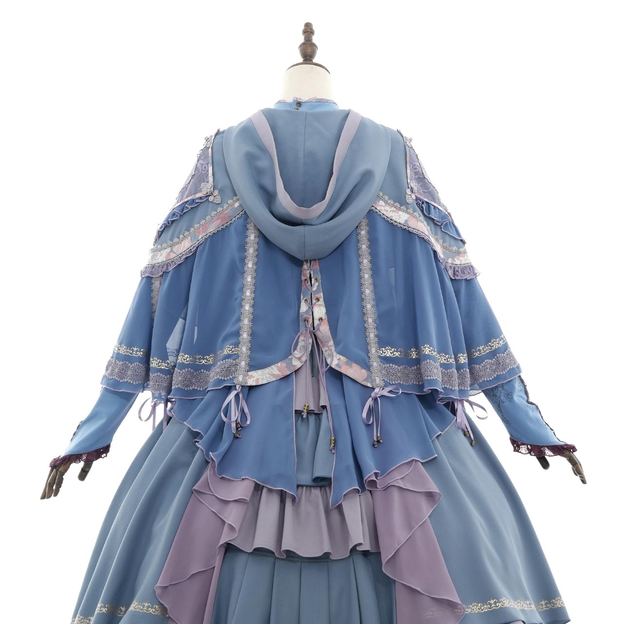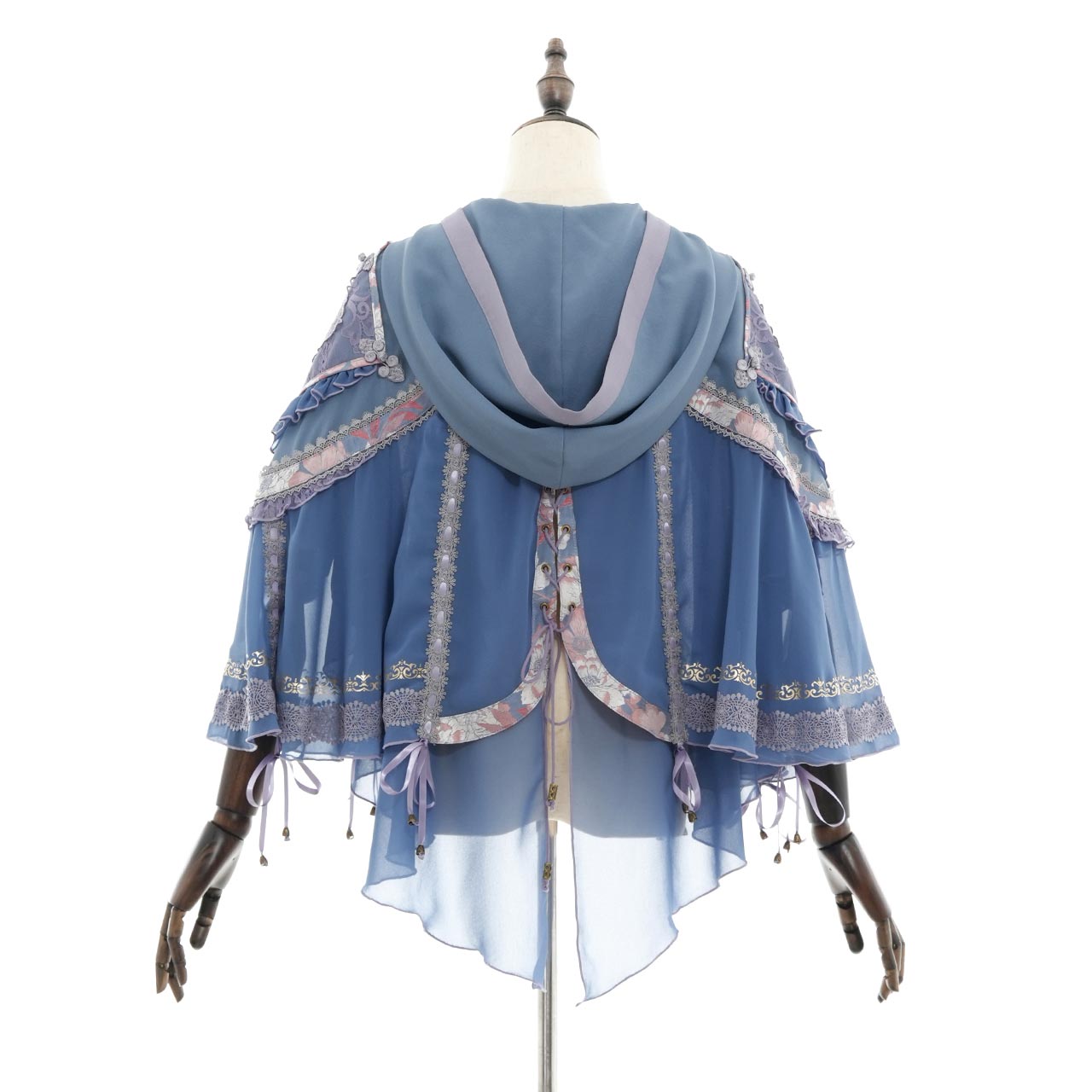 フード付きのケープに、装飾性の高いパーツを重ねたデザイン。