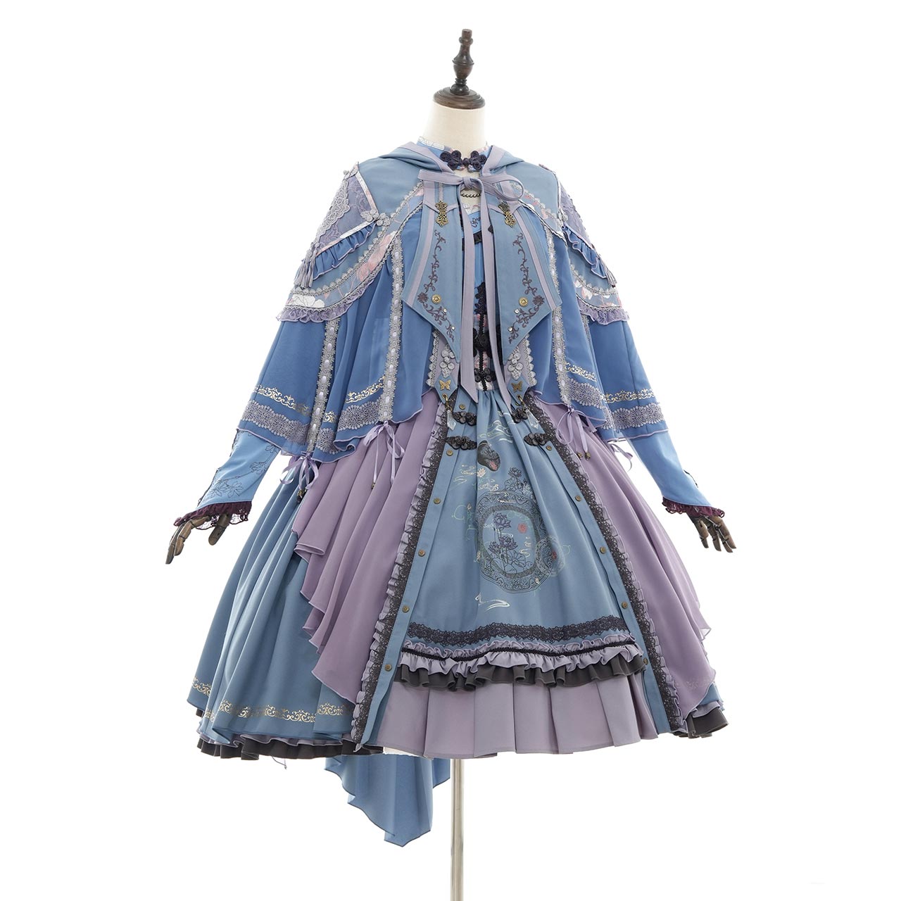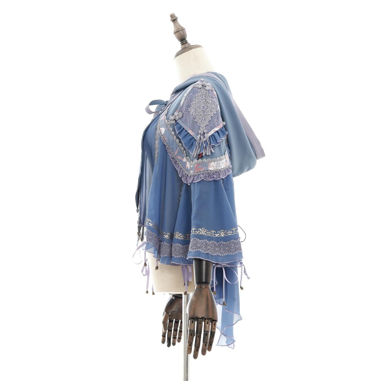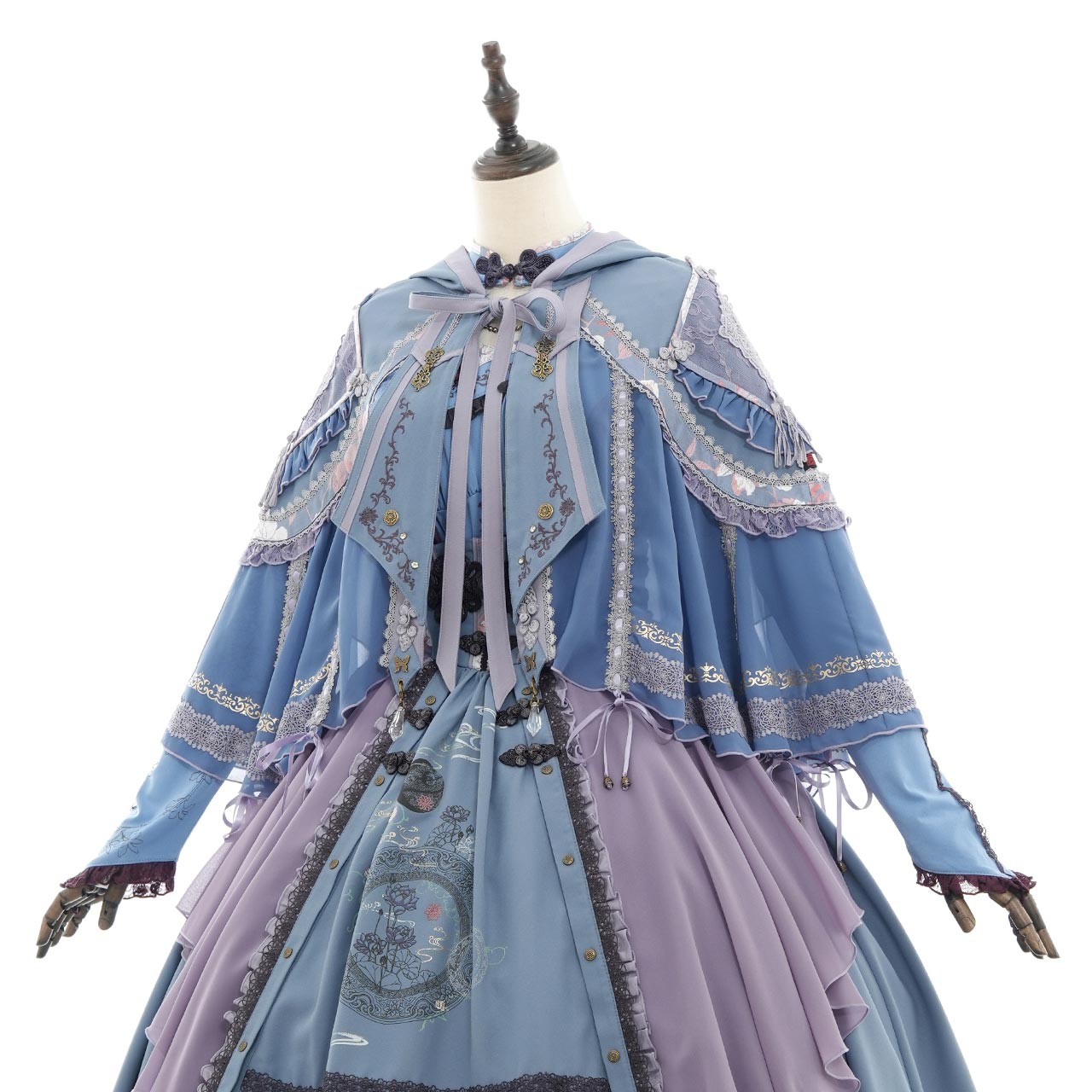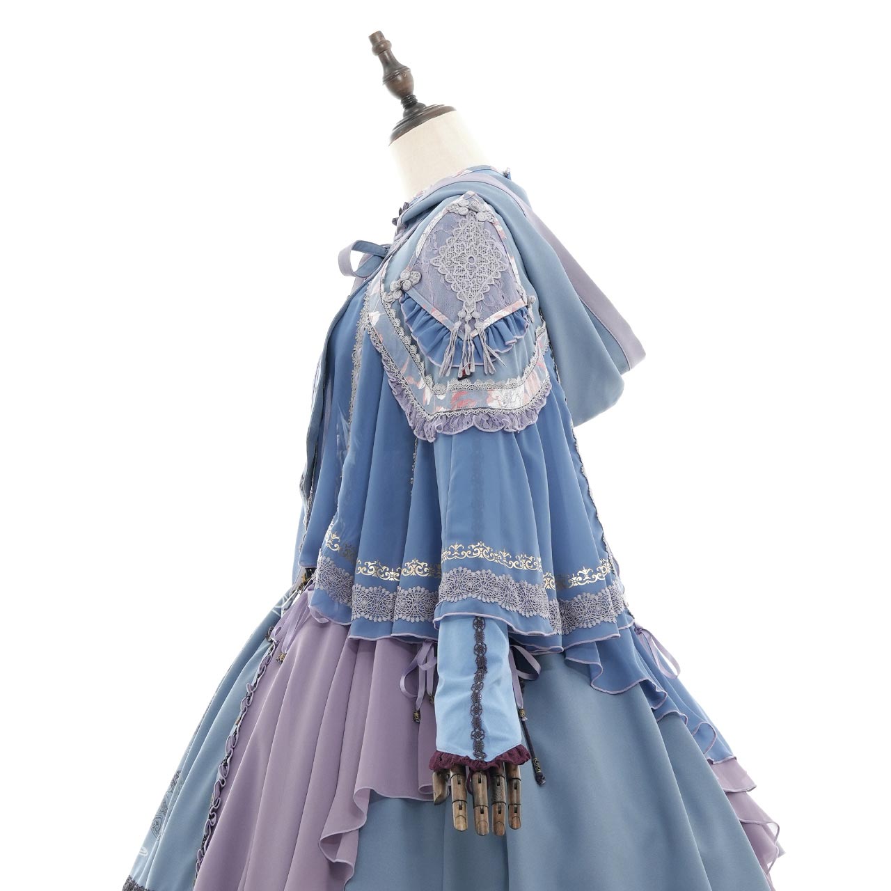 フード付きのケープに、装飾性の高いパーツを重ねたデザイン。