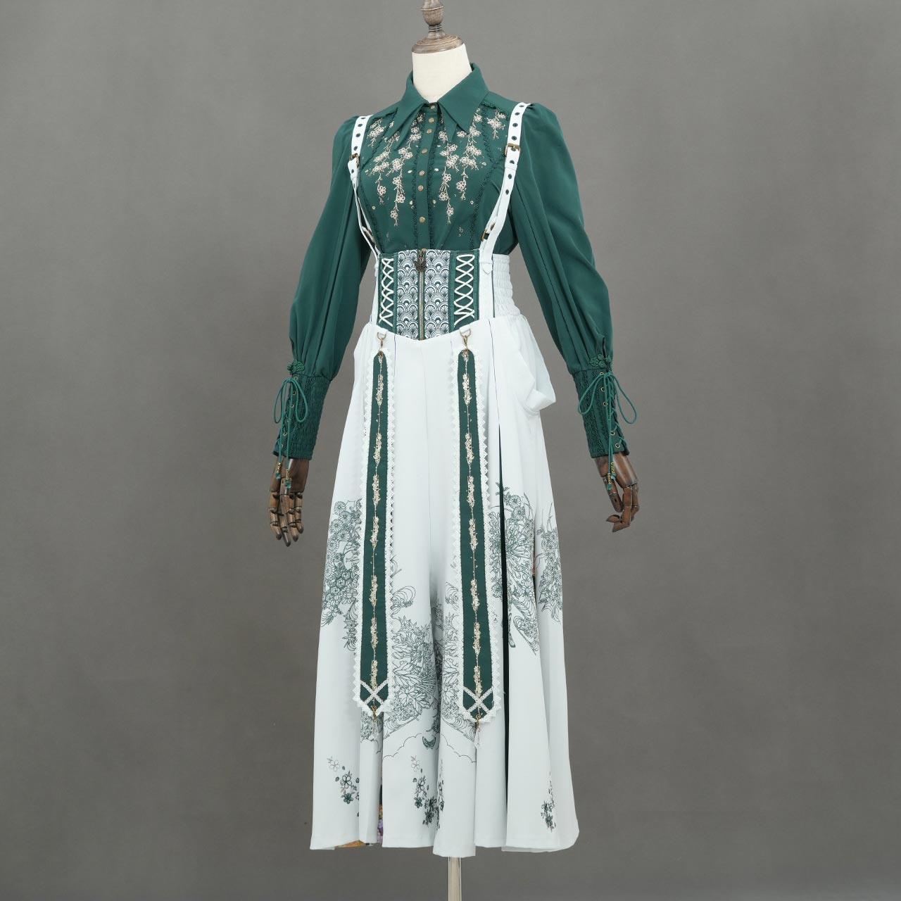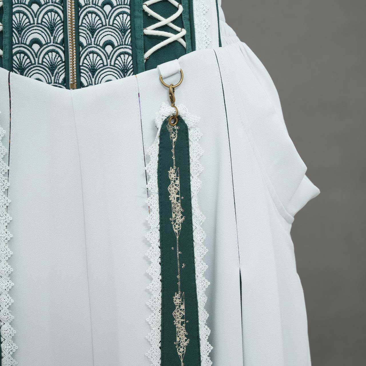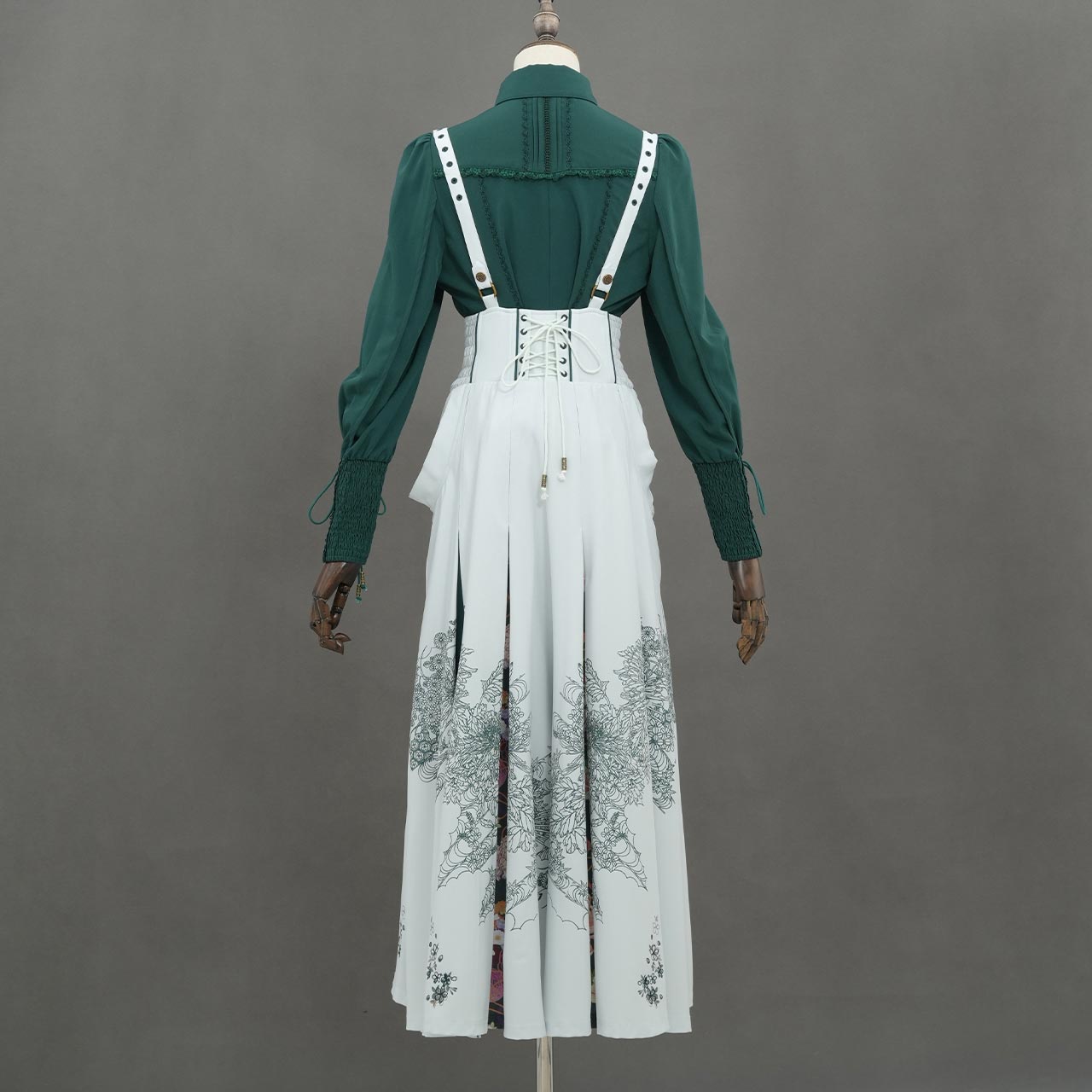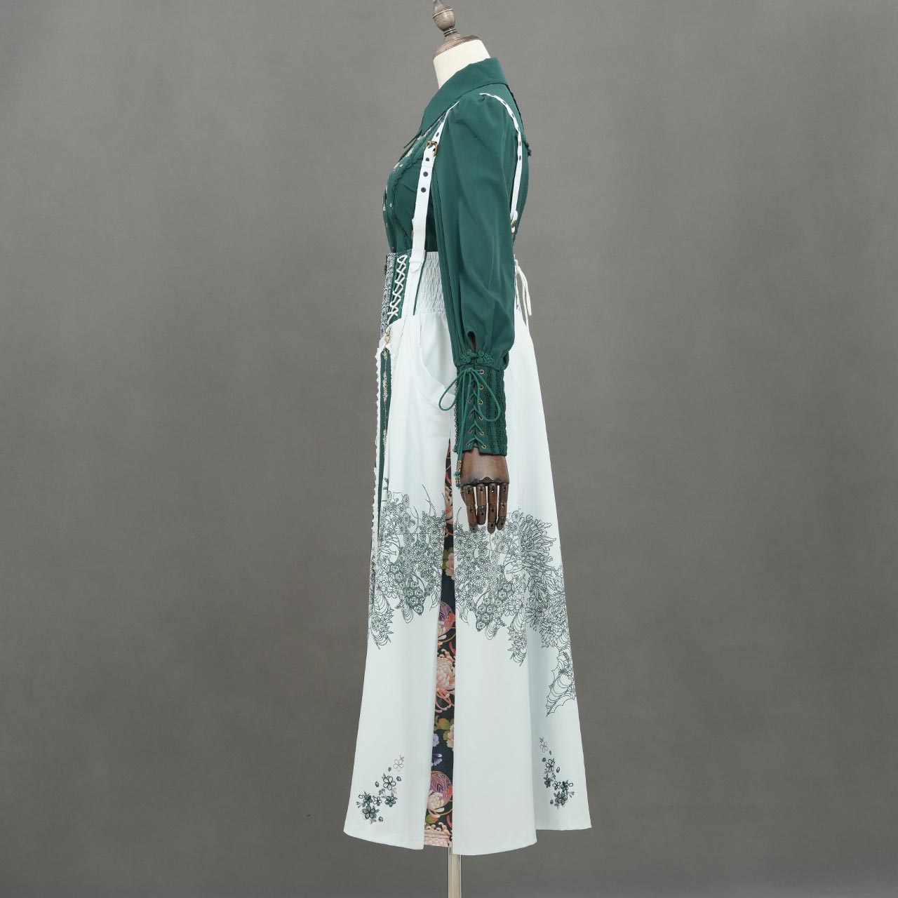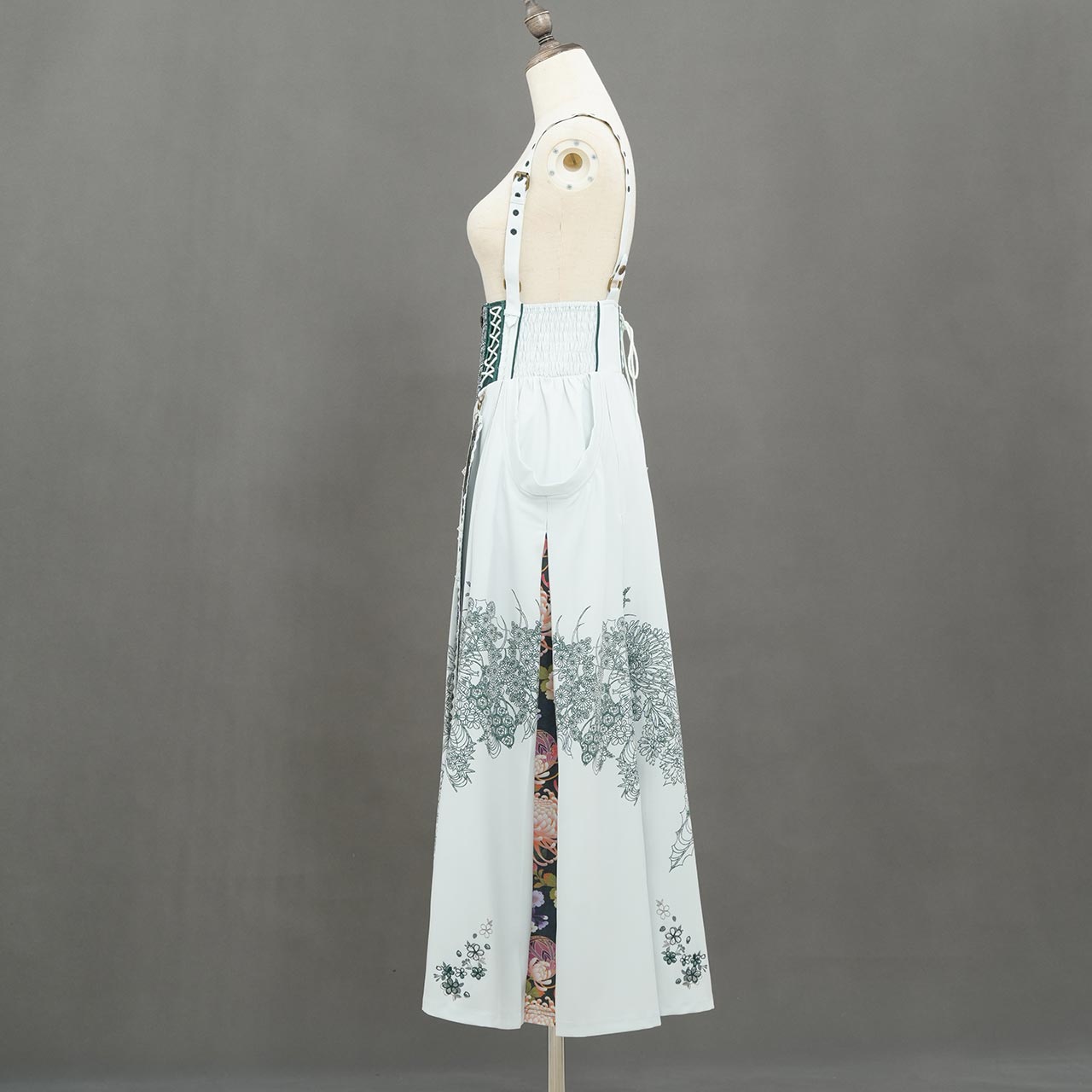 裾のプリーツ部分に繊細な和柄を配置。動作に合わせて柄が見え隠れする奥行きの大輪和柄図案。