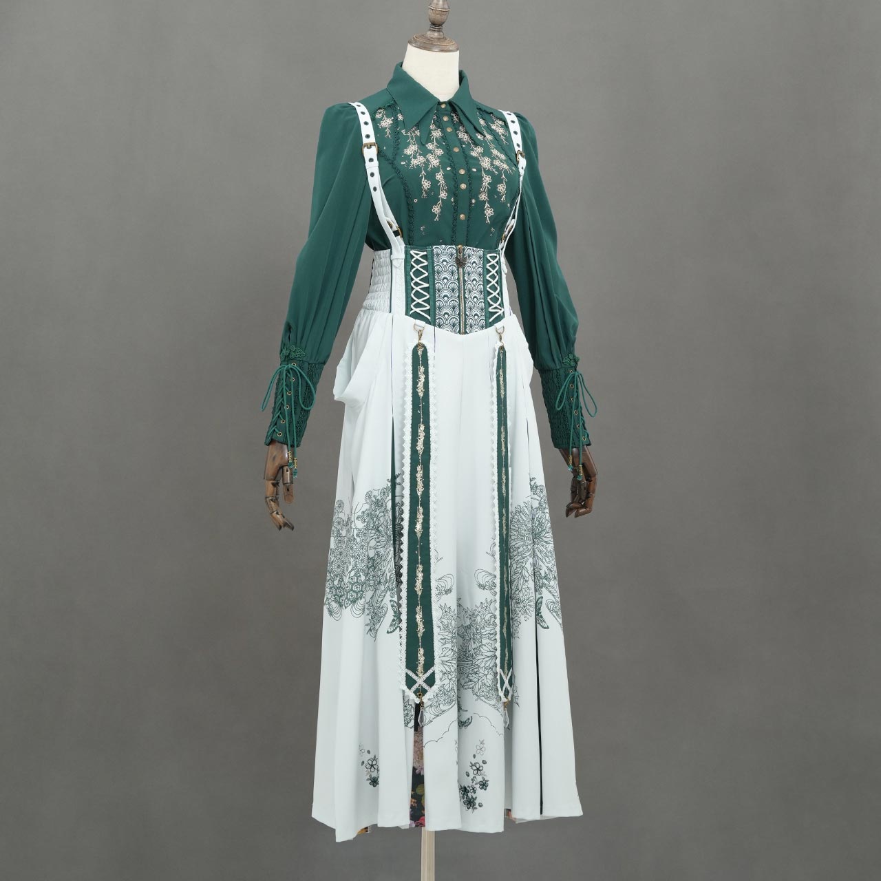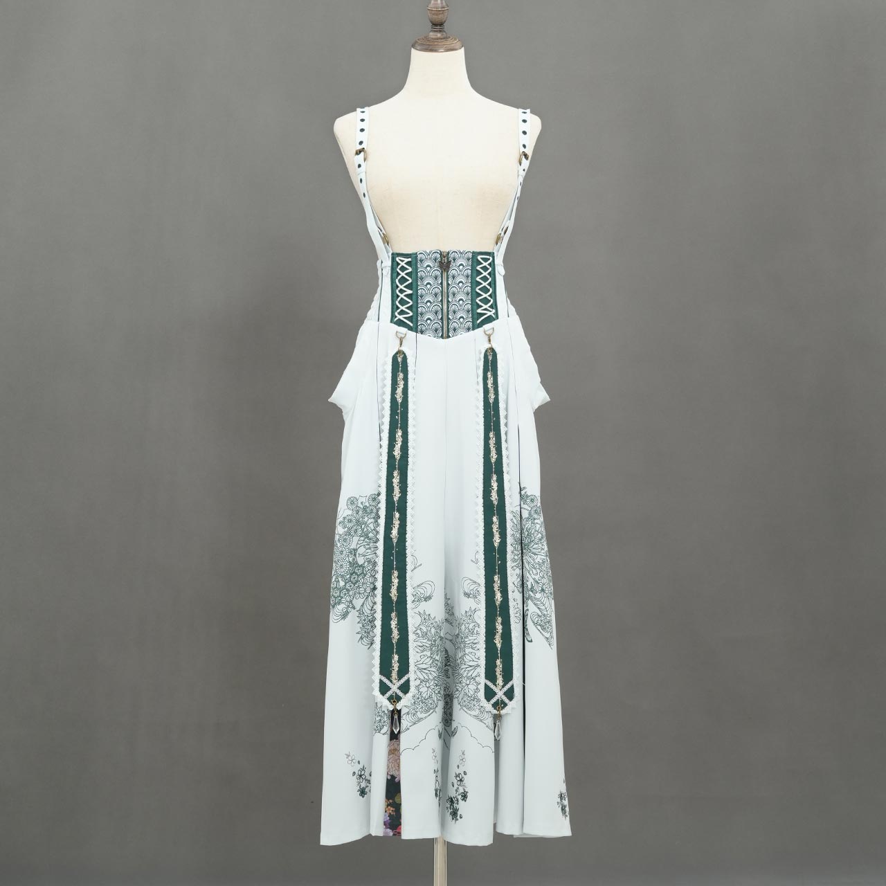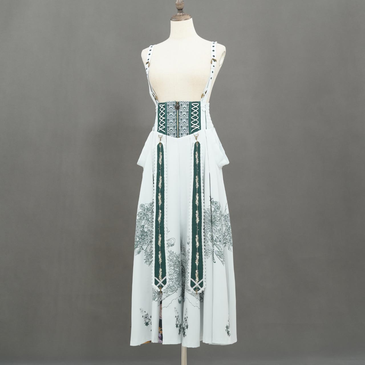 フロントファスナー仕様で着脱が容易。調整可能なサスペンダーとサイドの編み上げで、サイズ感の微調整も可能です。