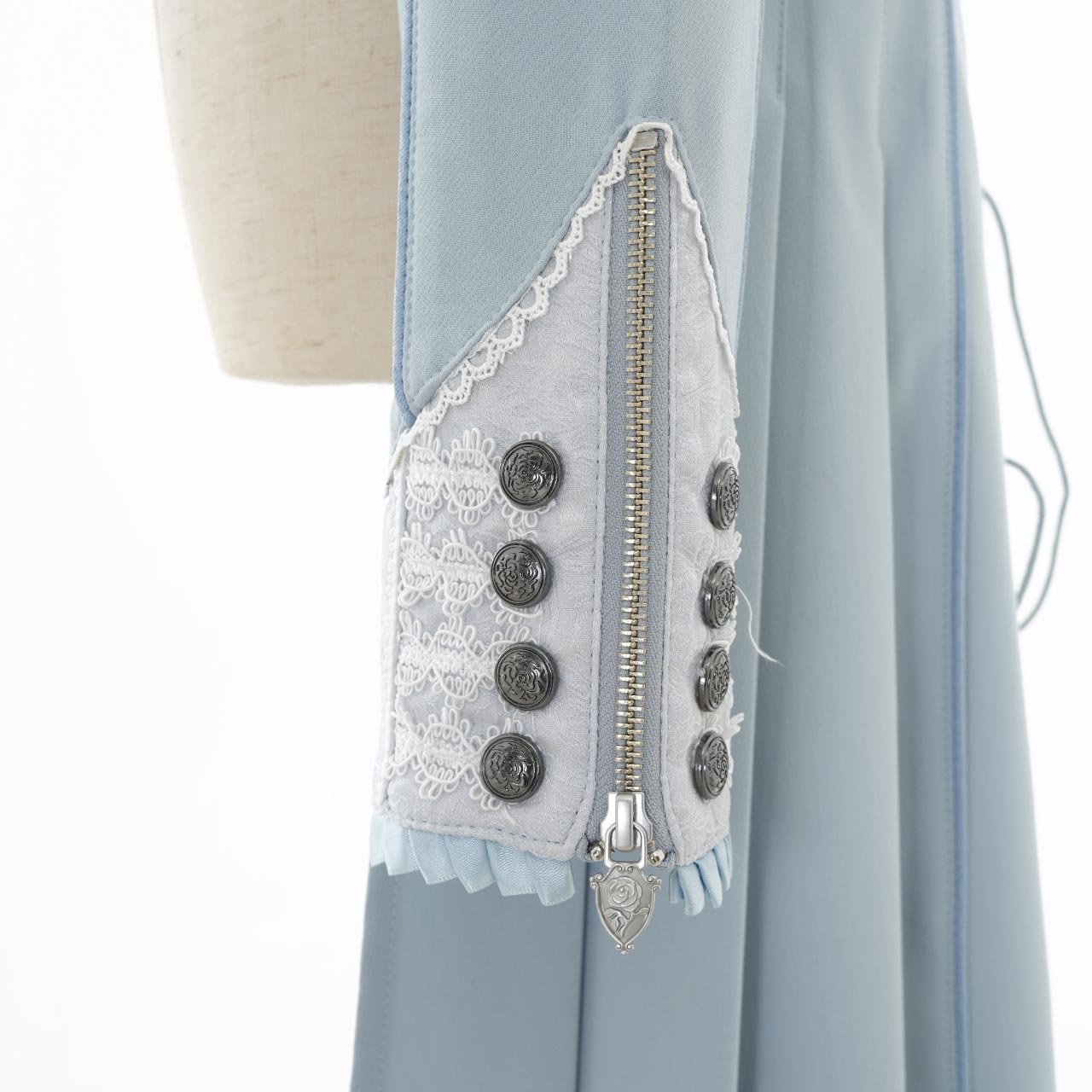 華やかな薔薇モチーフ刺繍や繊細なディテールが特徴的。ふわりと上品に流れるヘムラインは、歩くたびに幻想的な流れを生み出し、どこまでもエレガントな印象に。