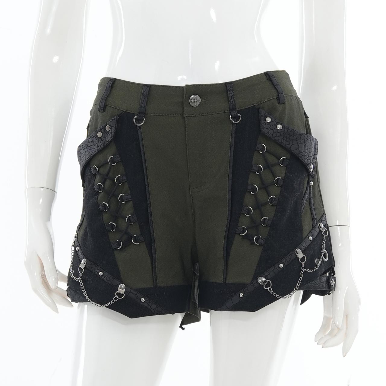 左右のレースアップとチェーンディテールが、洗練された印象を引き立てます。