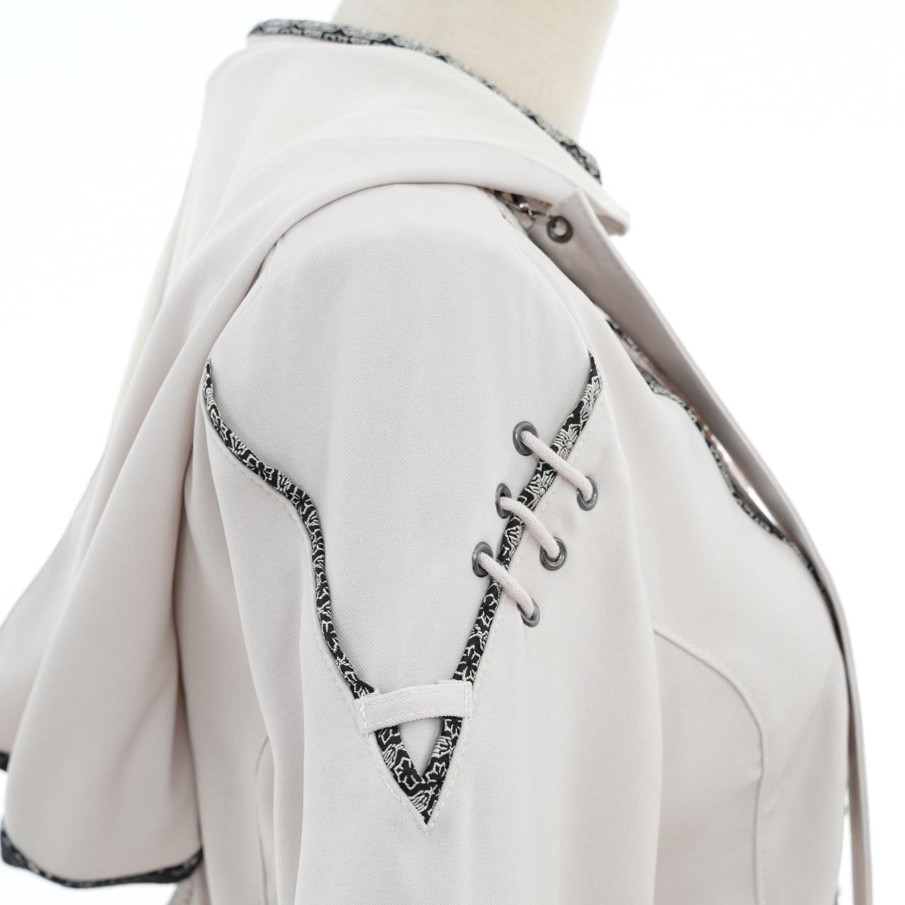 和洋折衷の世界観に洗練されたデザインが、日常のスタイルに品格と華やかさを添えてくれる一着。袖のファスナーを開くことでケープスリーブアレンジもお楽しみいただけます。